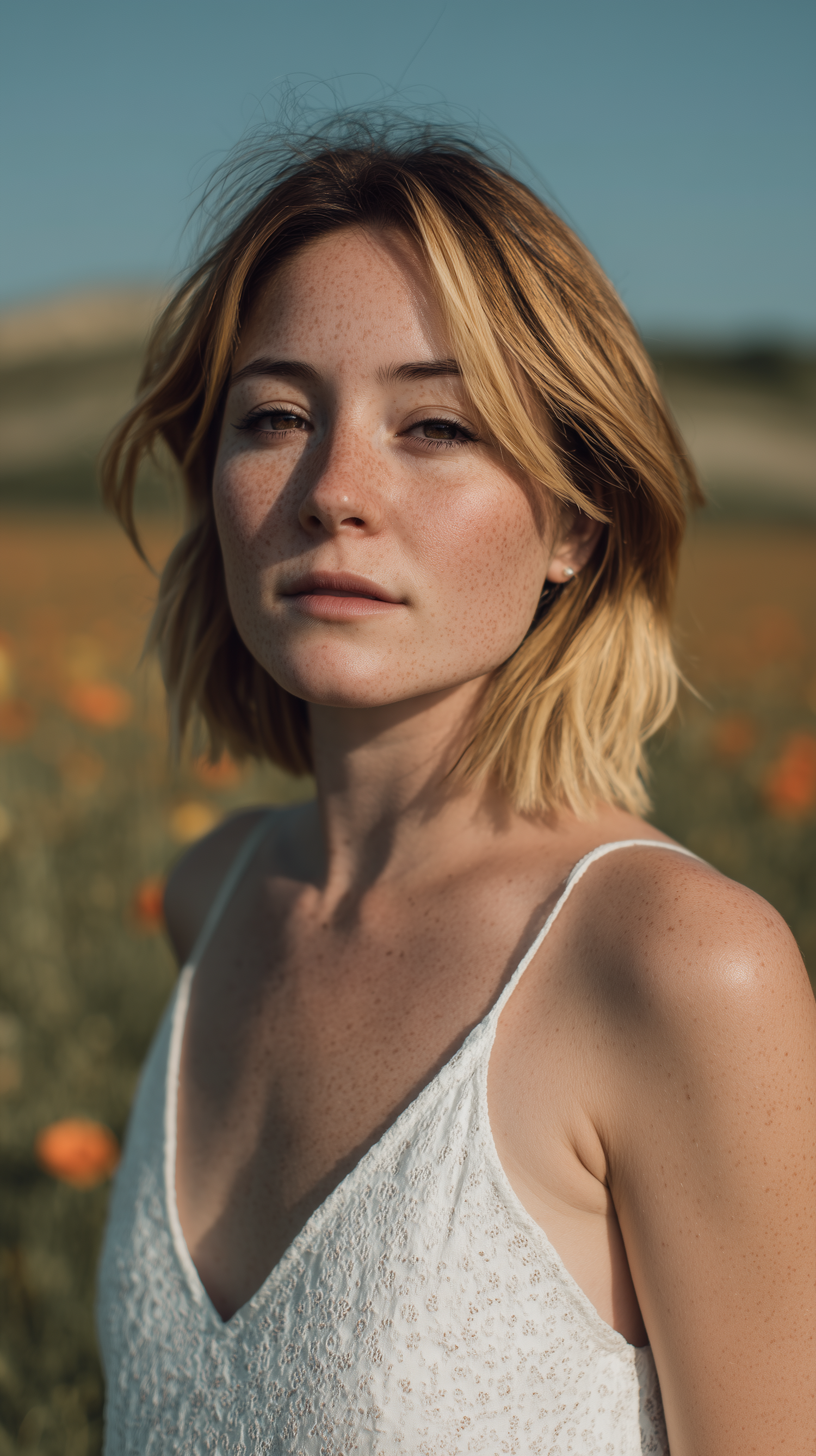 A serene portrait of a freckled woman in a white dress, standing in a sunlit field with orange flowers and a clear blue sky.