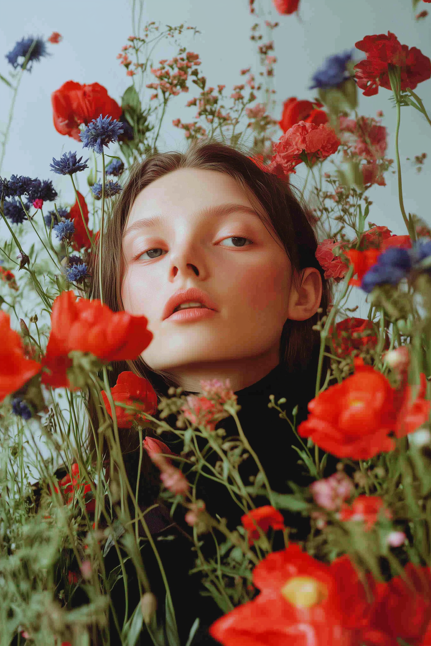 A serene portrait of a woman surrounded by vibrant red poppies and blue cornflowers, set against a soft blue background.