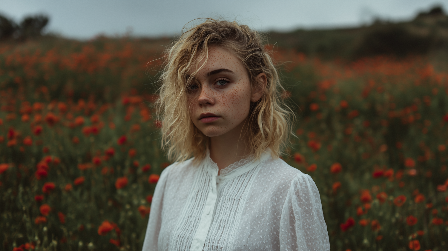 A young woman with blonde hair and freckles stands in a field of red flowers, wearing a white blouse, under soft, overcast lighting.