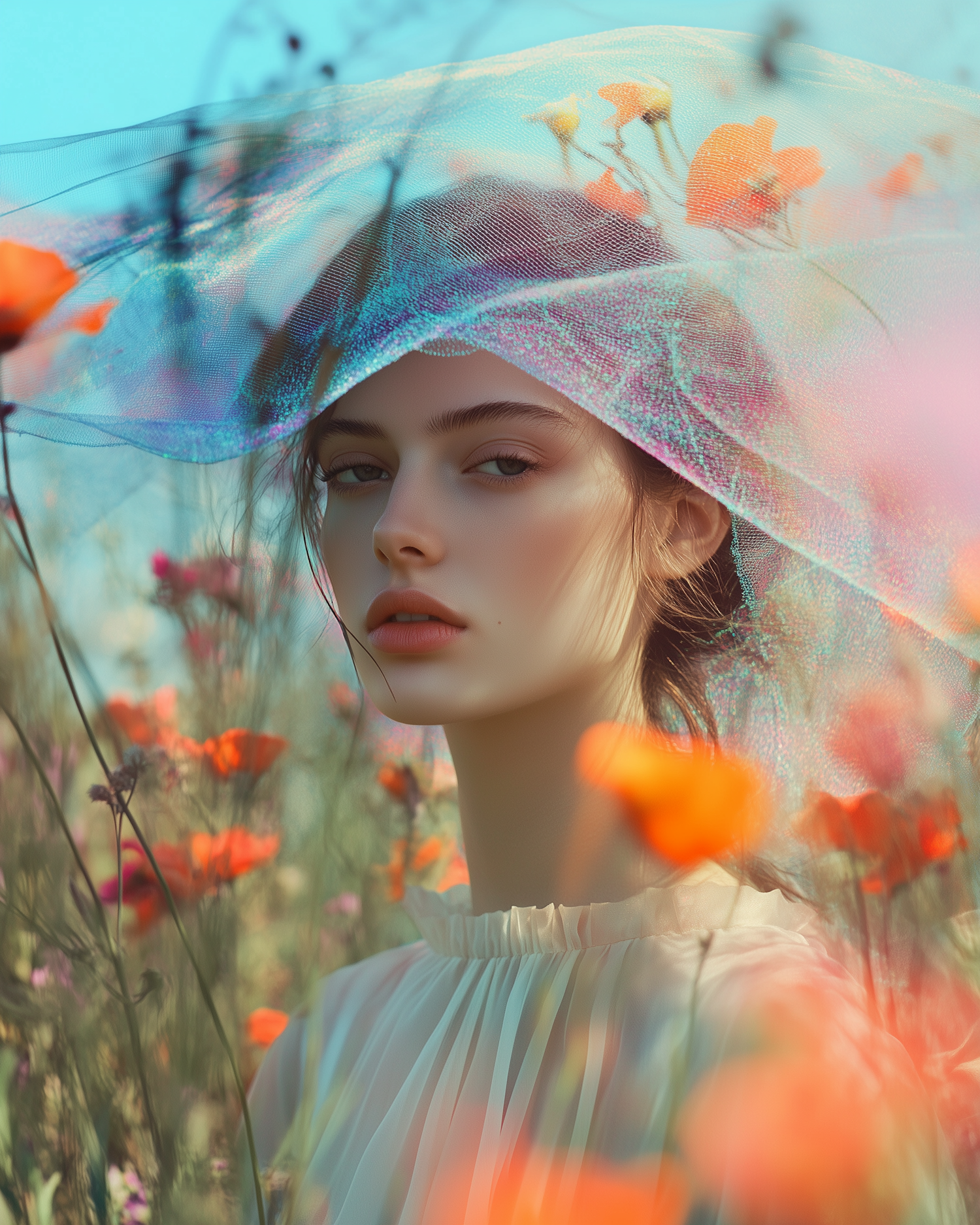 A serene woman in a flower field, wearing a sheer blouse and iridescent veil, surrounded by vibrant orange and pink blooms.