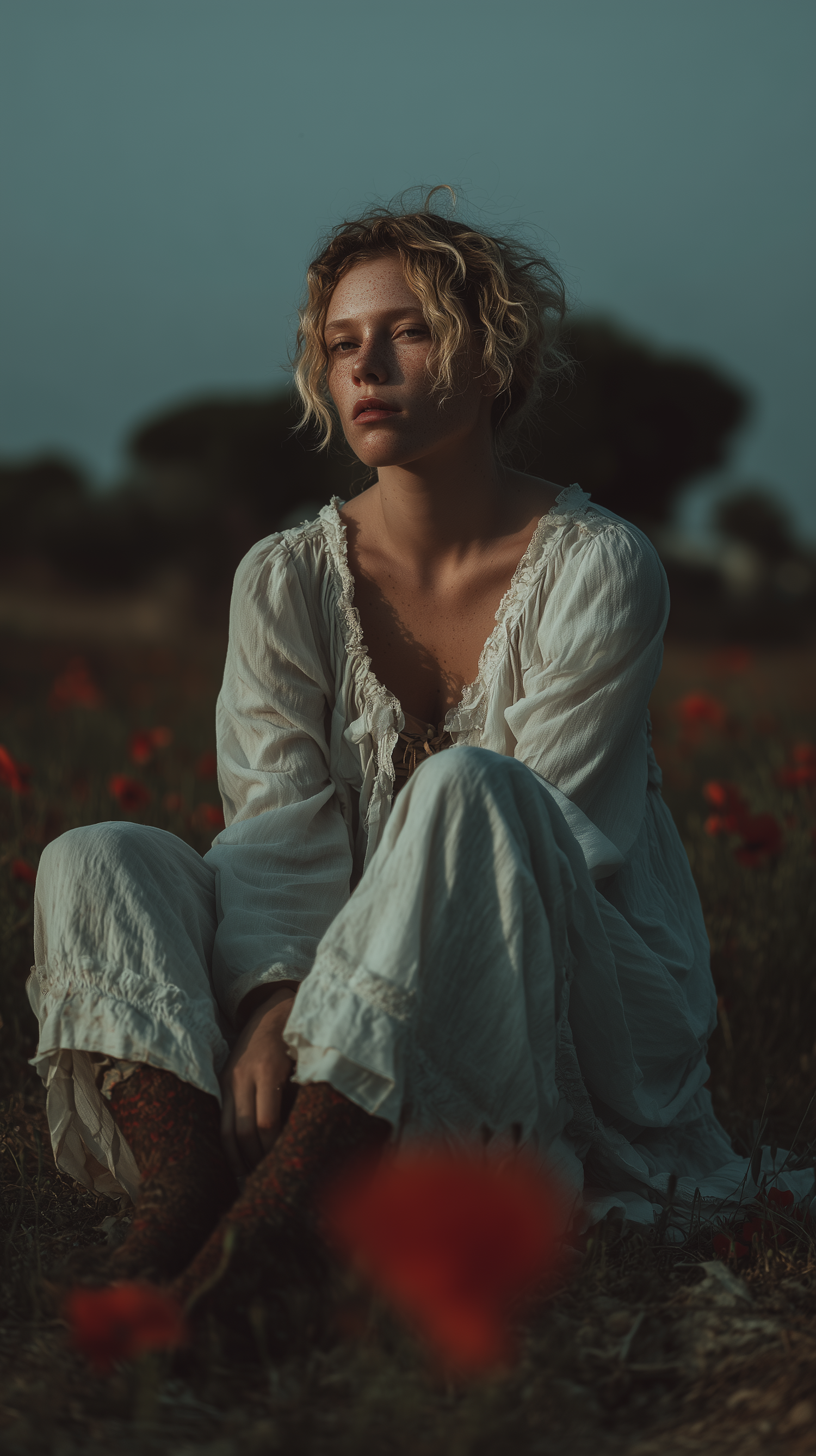 A serene portrait of a woman in a white dress sitting in a field of red flowers, captured in soft, warm lighting.