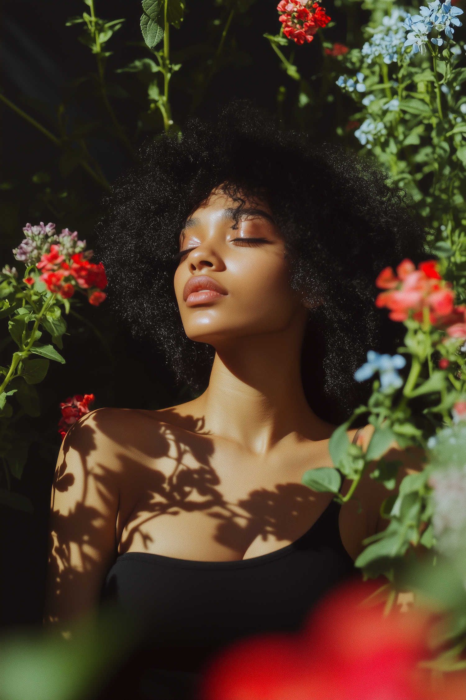 A serene portrait of a woman with natural curls, basking in sunlight amidst vibrant flowers and lush greenery.