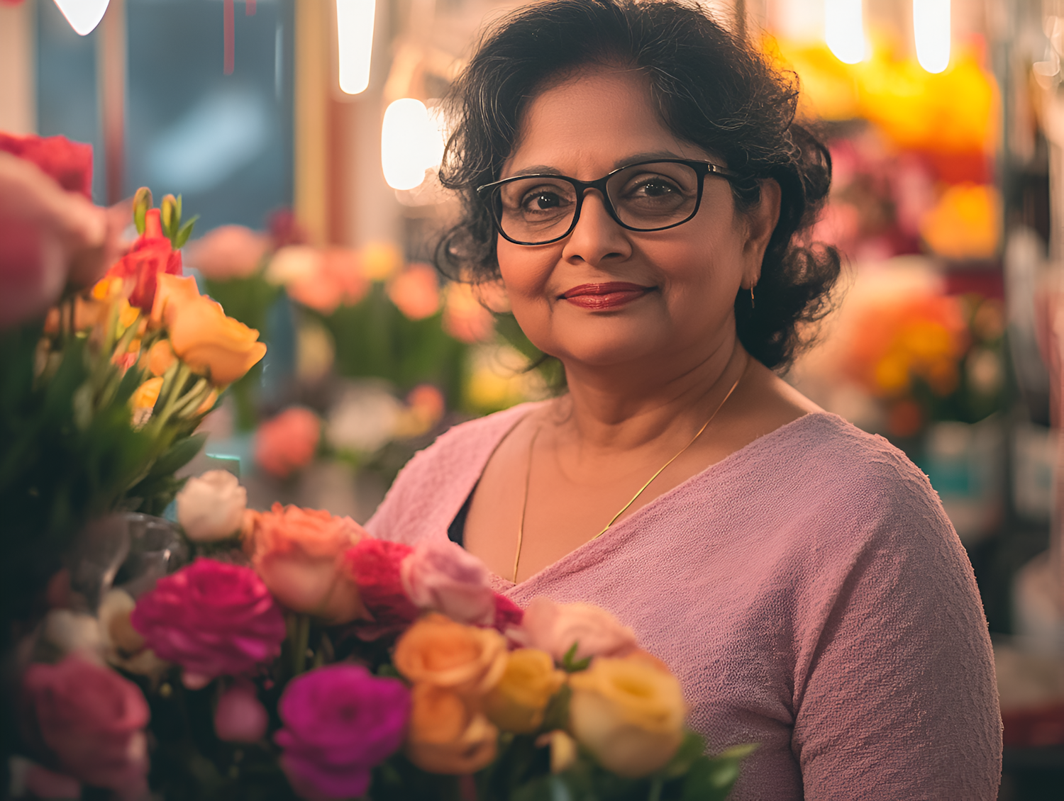 South Asian woman in a flower shop, surrounded by colorful blooms, wearing glasses and a pink sweater, smiling warmly.