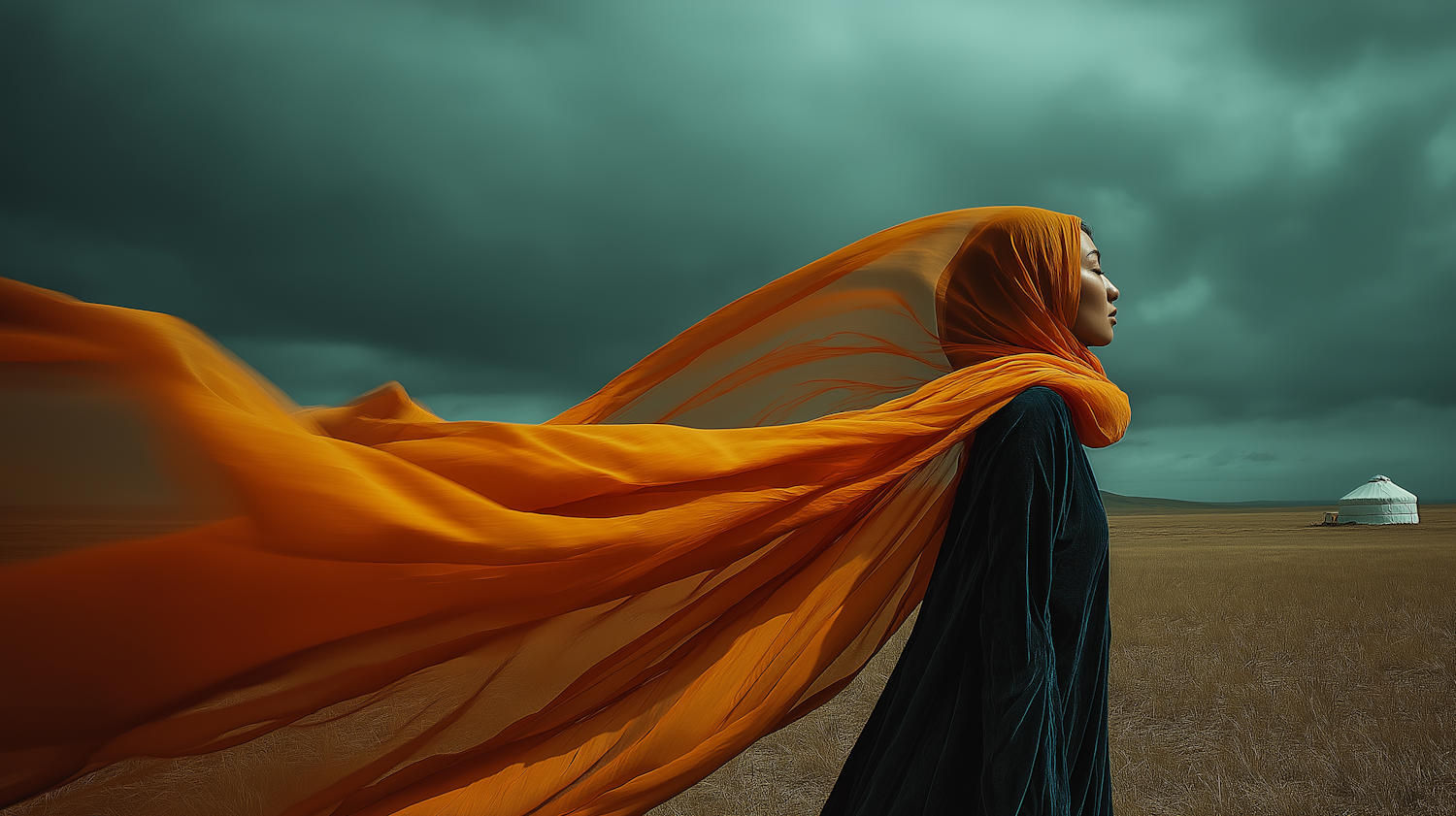 A woman in a flowing orange scarf stands in a vast field under a dramatic sky, with a white yurt in the background. Stunning and serene.