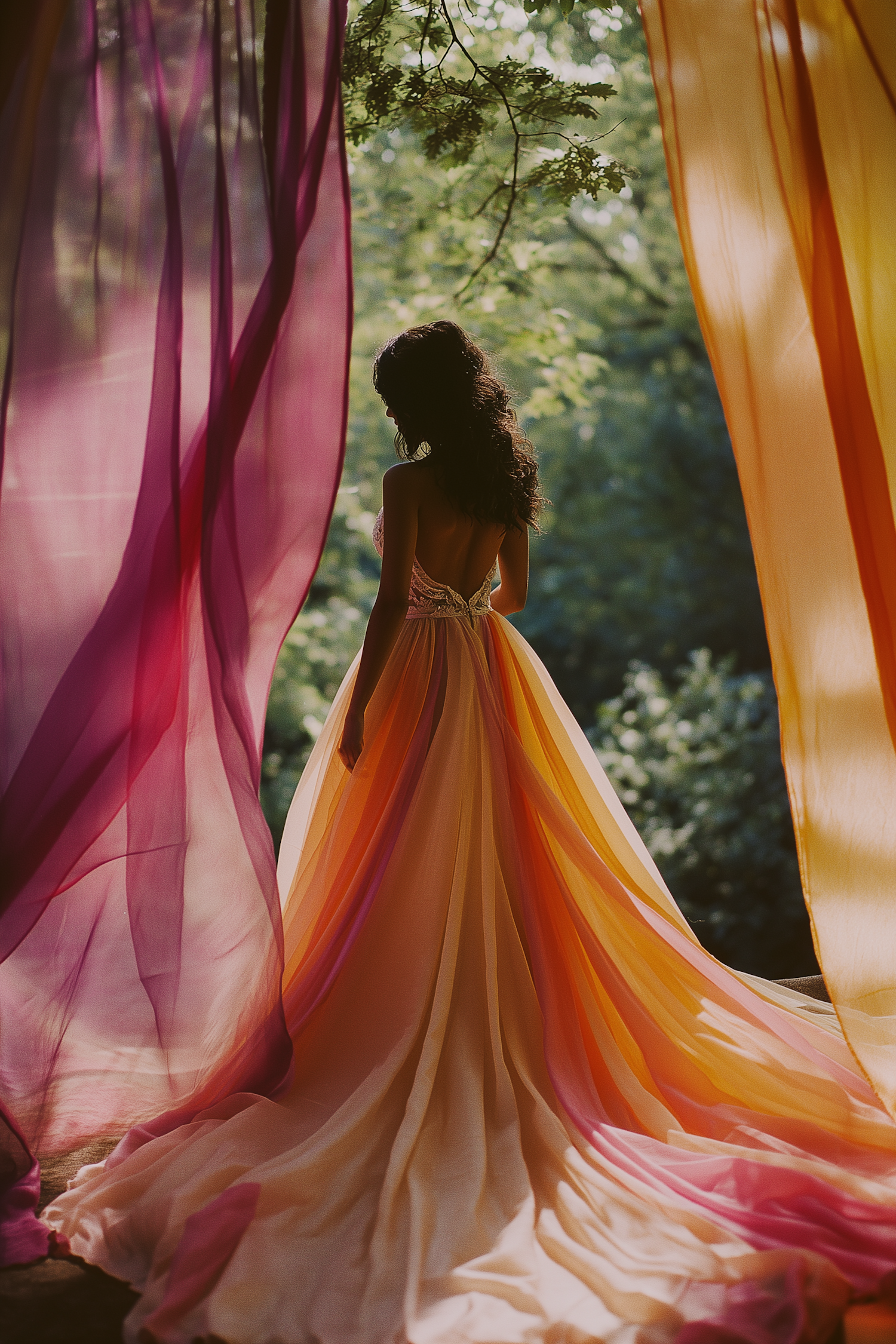 A woman in a flowing pink and orange gown stands in a dreamy forest setting, framed by colorful drapes.