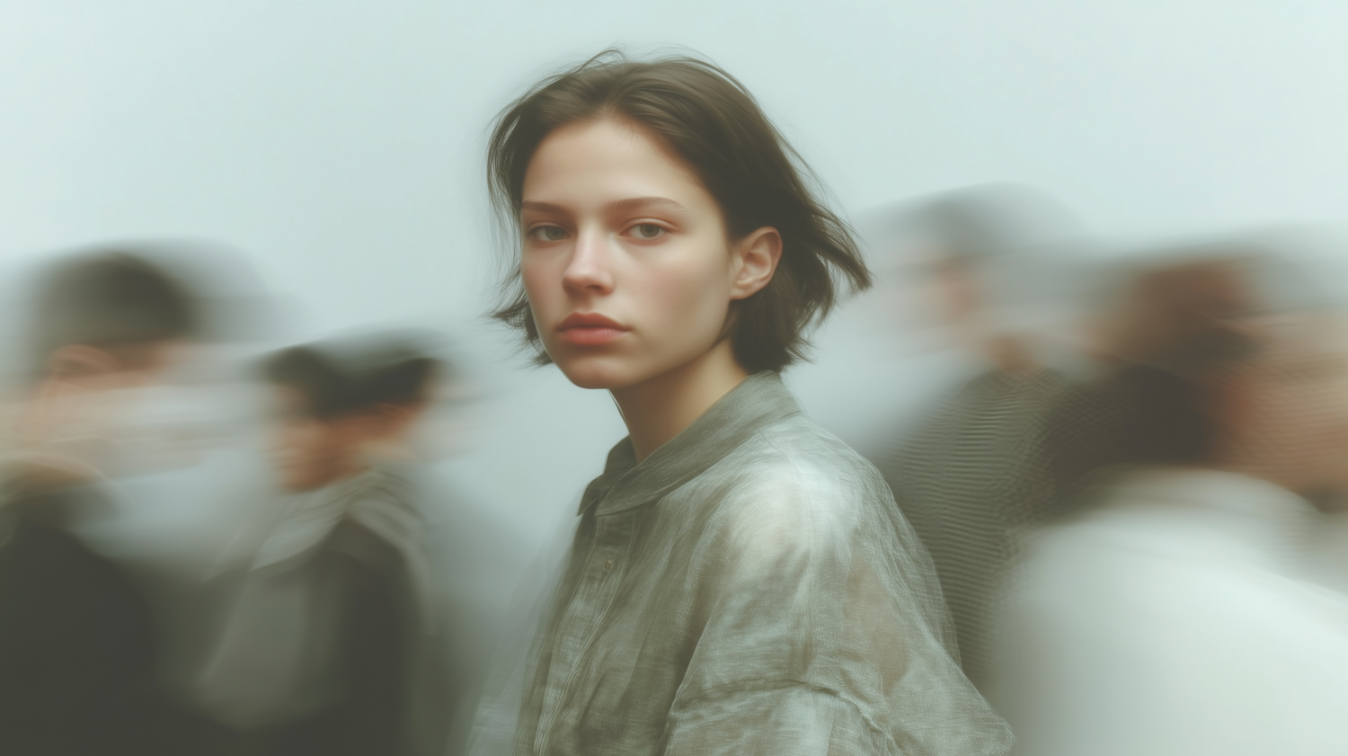 A young woman stands still in focus while a blurred crowd moves around her, creating a striking contrast of stillness and motion.