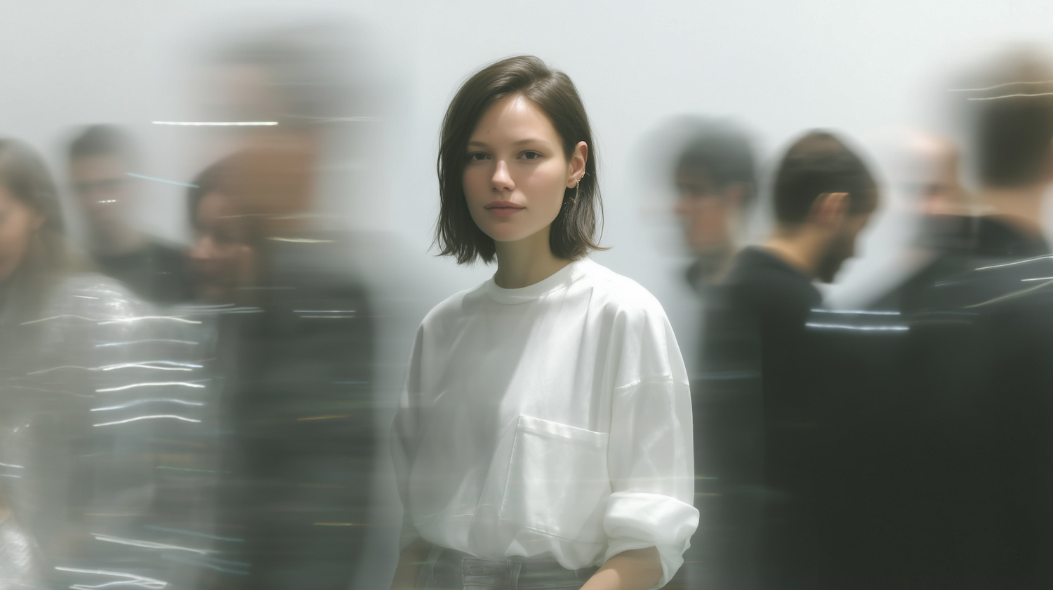 A serene woman in a white shirt stands still amidst a blurred, moving crowd, creating a striking contrast of focus and motion.