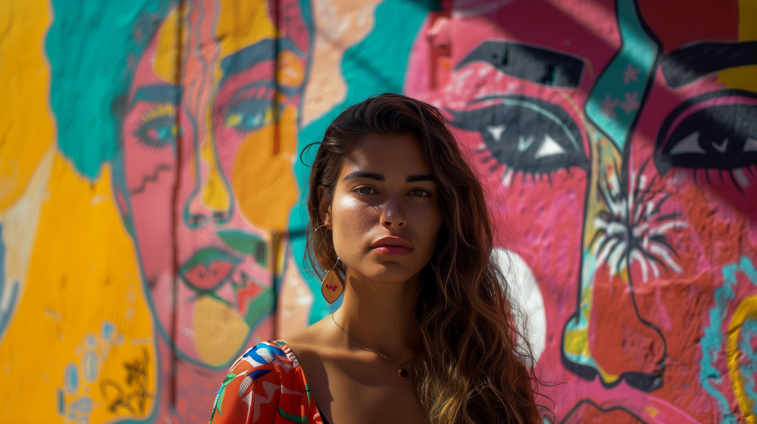 Young woman with wavy brown hair in front of vibrant graffiti wall, wearing colorful dress and earrings, in sunlight.