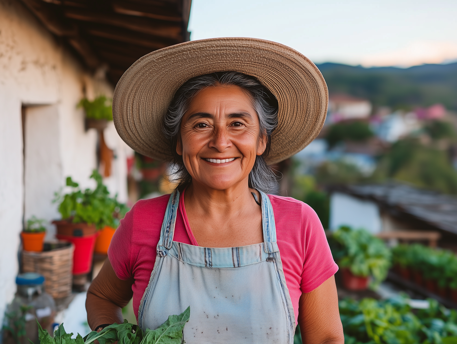 Smiling woman in a straw hat and apron holding fresh greens in a garden setting, exuding warmth and friendliness.
