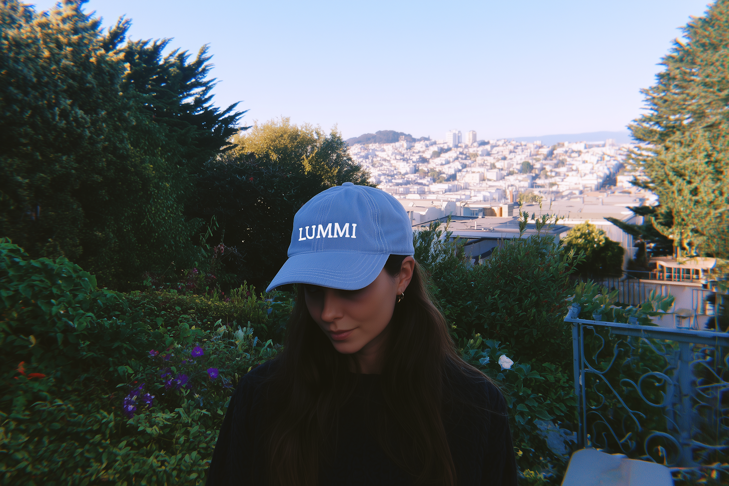 Woman in a blue 'LUMMI' cap in a lush garden with a cityscape in the background under a clear blue sky.