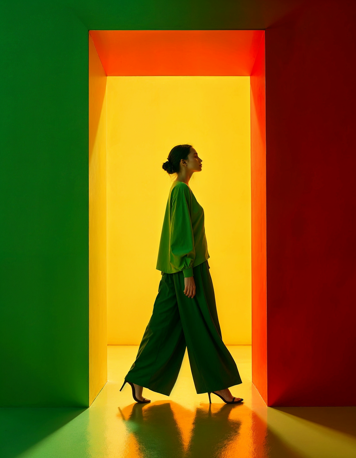 A woman in a green outfit walks through a vibrant space with green, red, and yellow walls, creating a bold and artistic visual.
