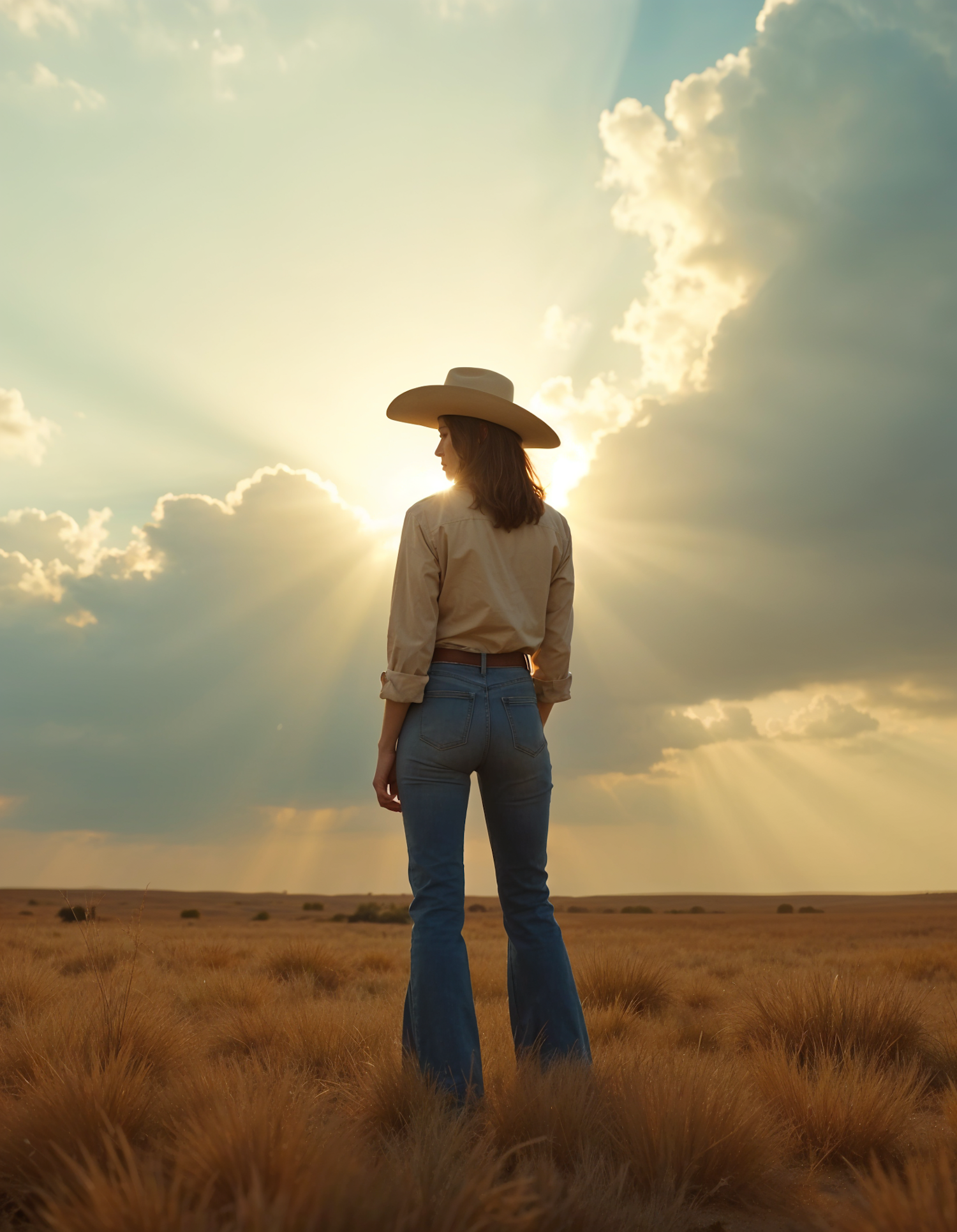 A woman in a beige hat and flared jeans stands in a golden field, with sunlight streaming through dramatic clouds in the background.