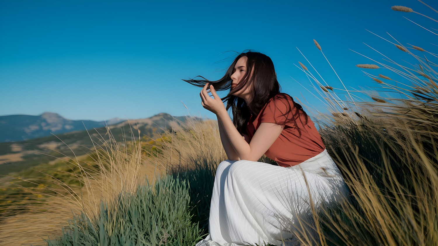 A serene moment of a woman in a rust top and white skirt sitting in golden grass with mountains and a clear blue sky in the background.