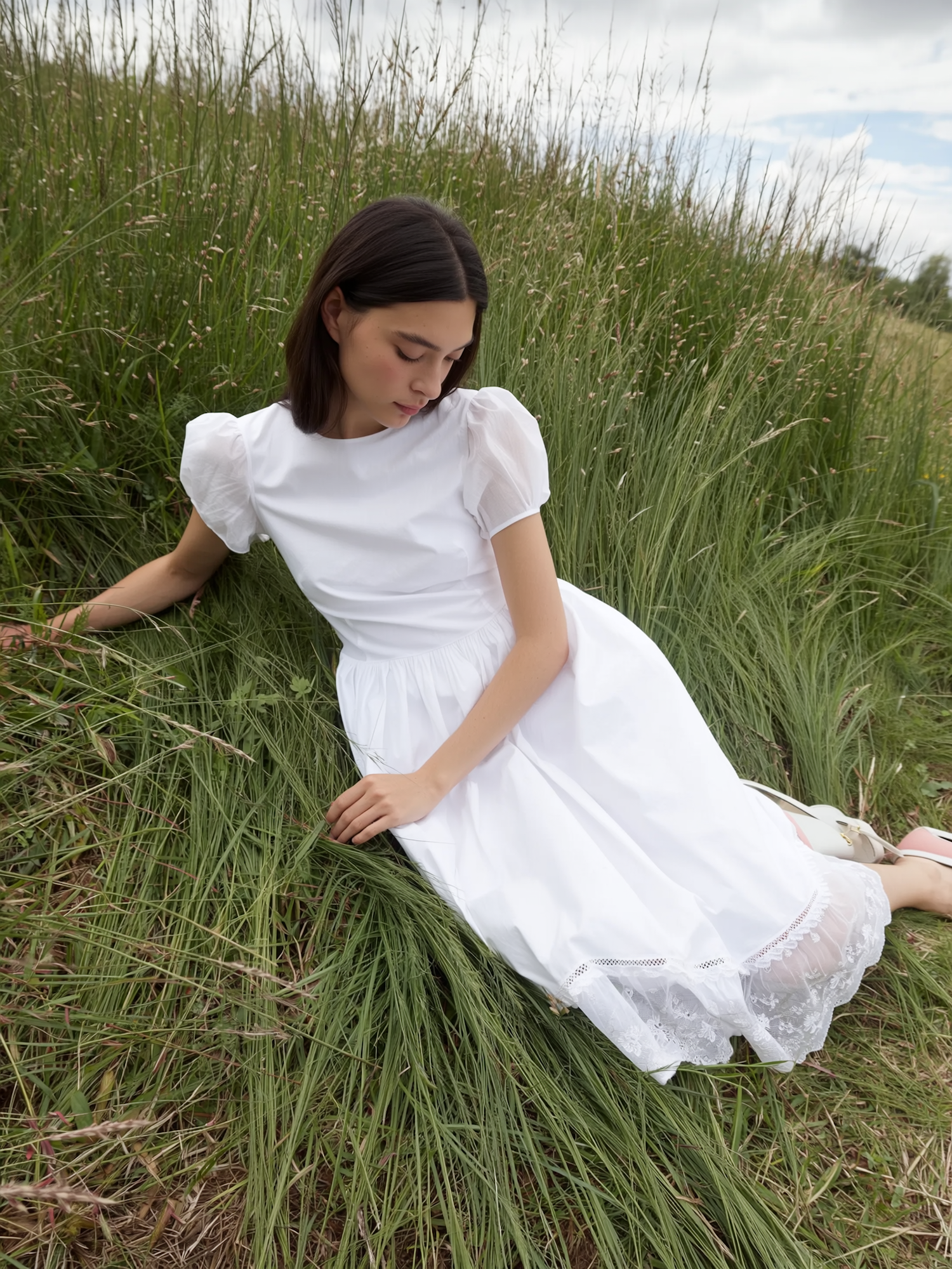 A serene moment of a woman in a white dress sitting in a lush green field under a partly cloudy sky.