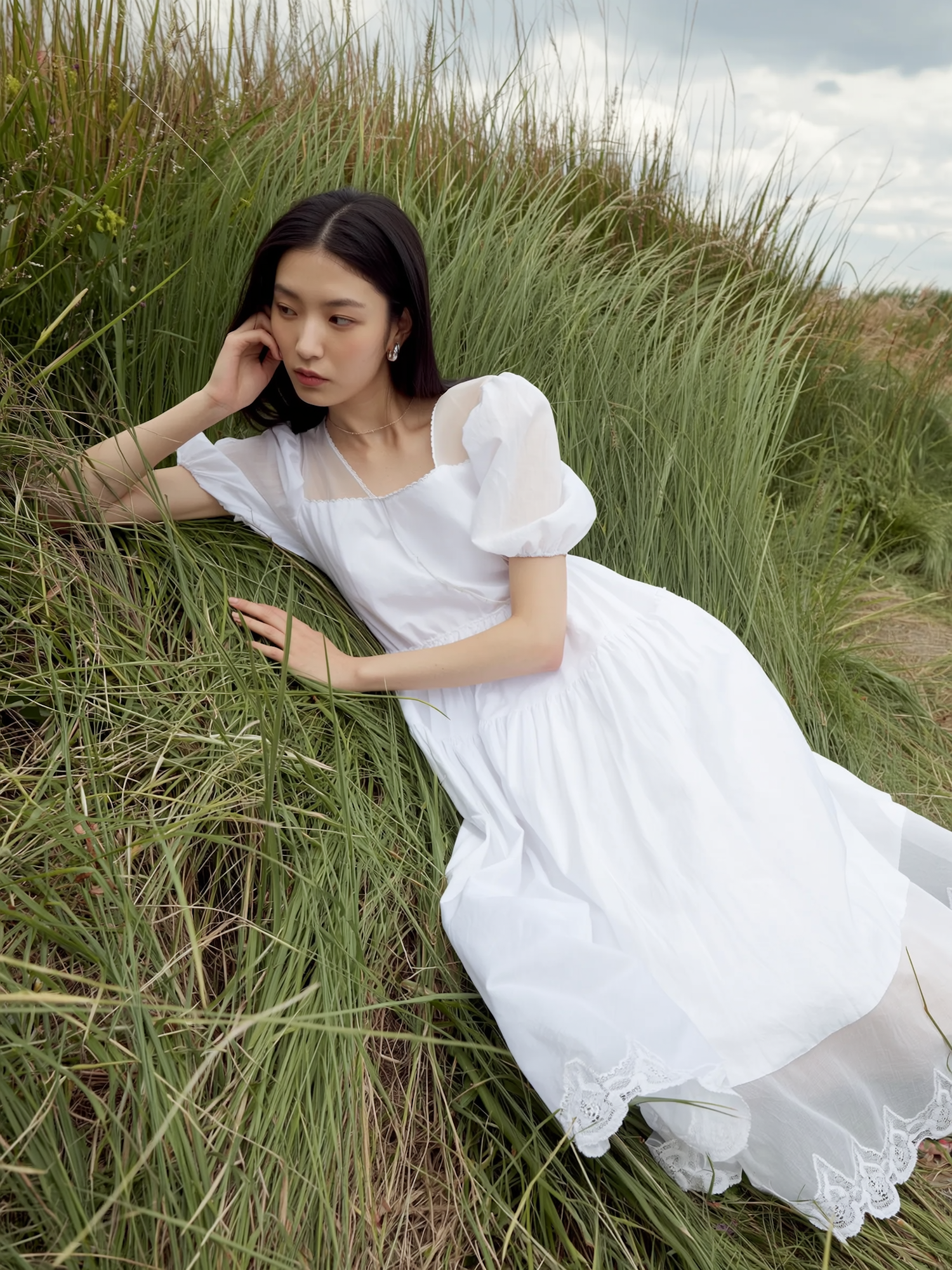 A serene portrait of a woman in a white dress reclining in a grassy field under a cloudy sky, evoking a peaceful and natural vibe.