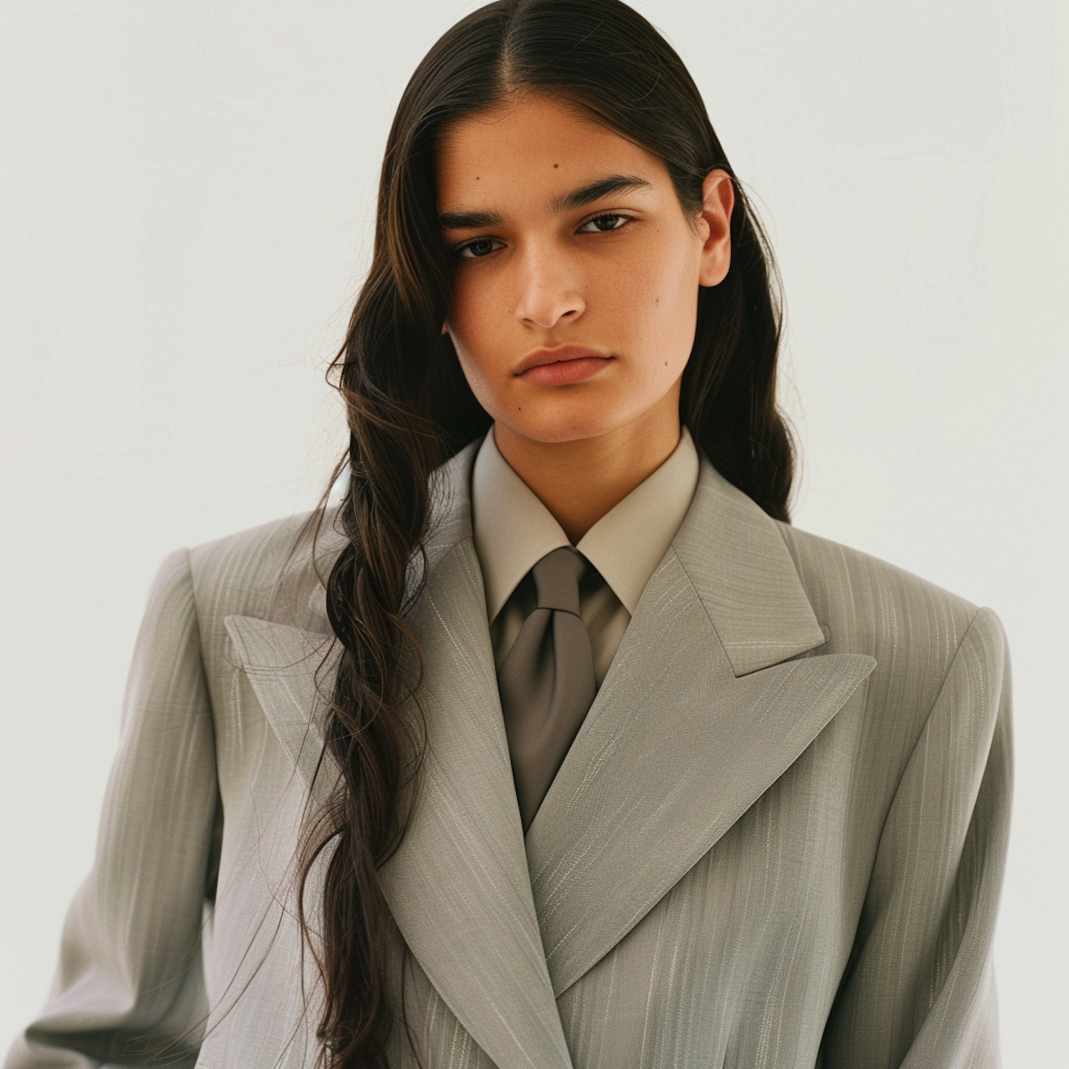 A woman in a light gray pinstripe suit with a matching tie and shirt, styled with long wavy hair and a braided detail, against a white background.