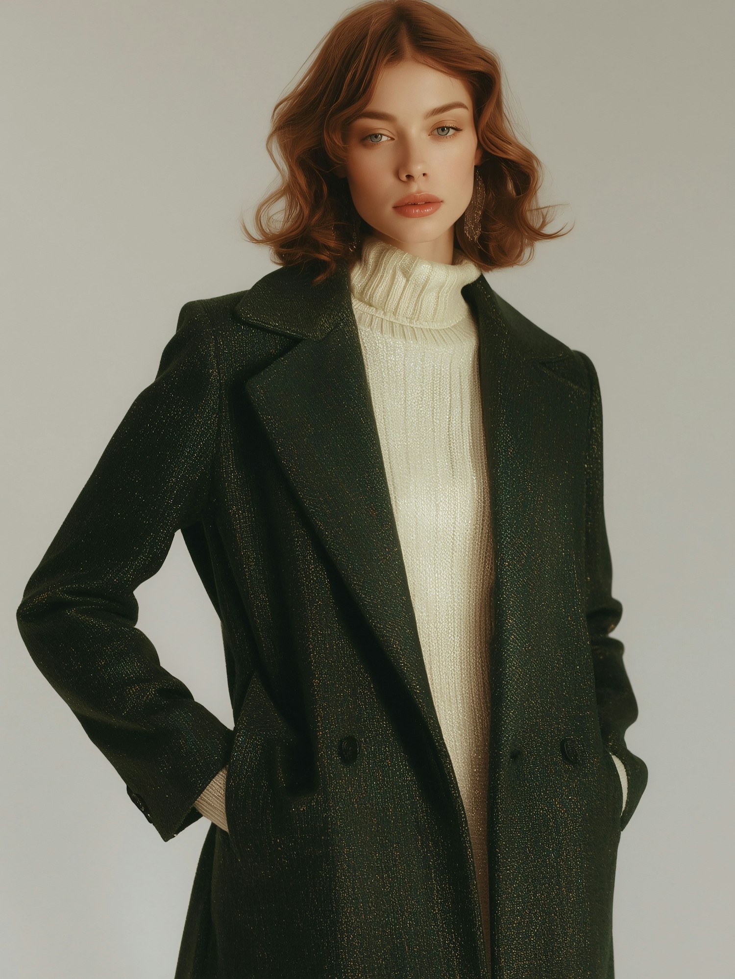 Stylish woman in a shimmering green coat and cream turtleneck, posing against a neutral background. Perfect for fashion inspiration.