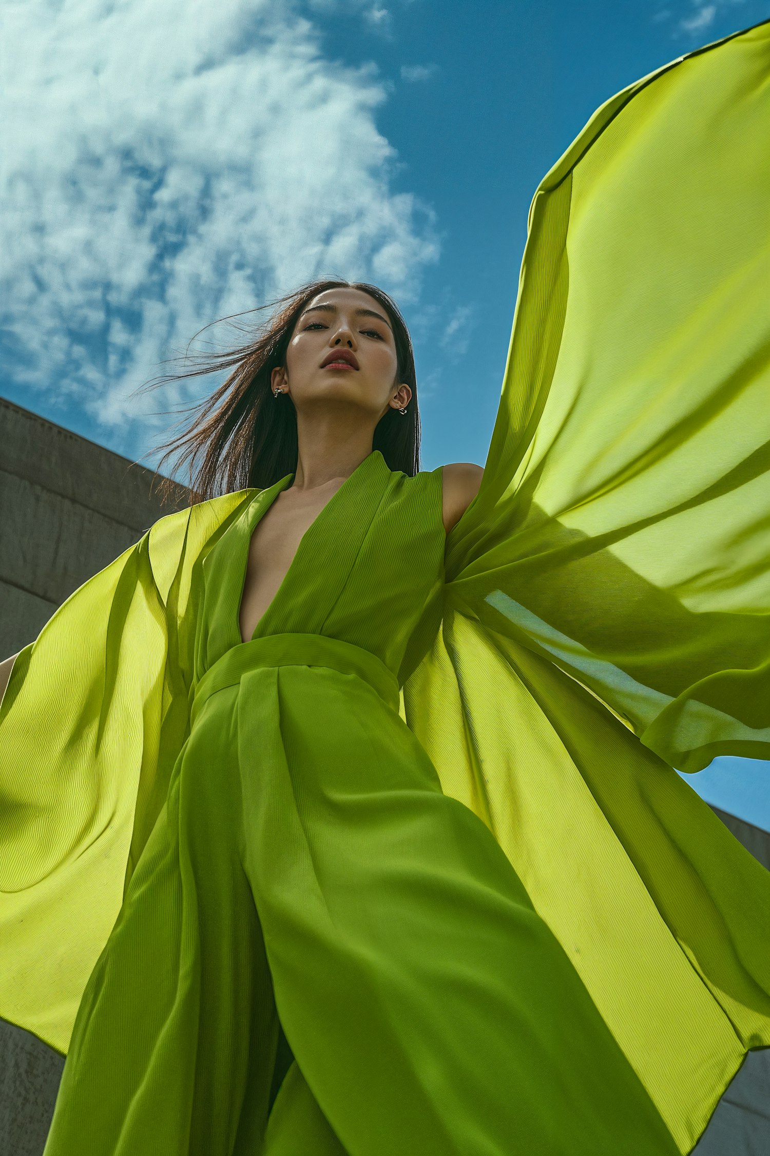 Asian woman in a flowing lime green dress against a bright blue sky, exuding elegance and grace with dramatic fabric movement.