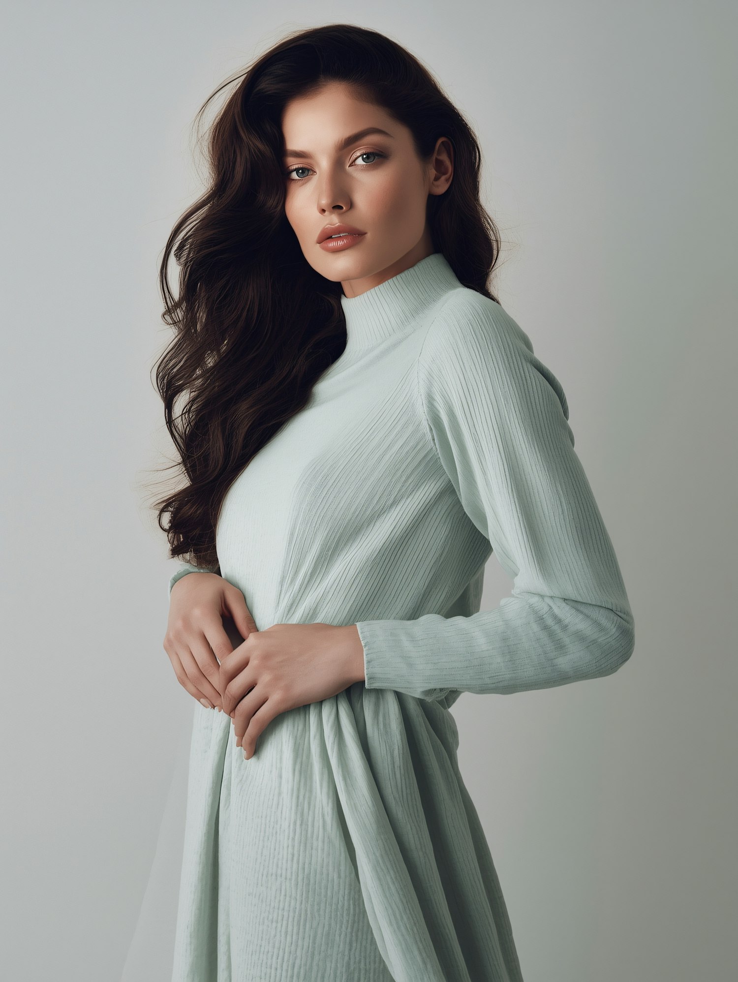 Elegant woman in a light green textured dress, posing gracefully with soft lighting and a neutral background.