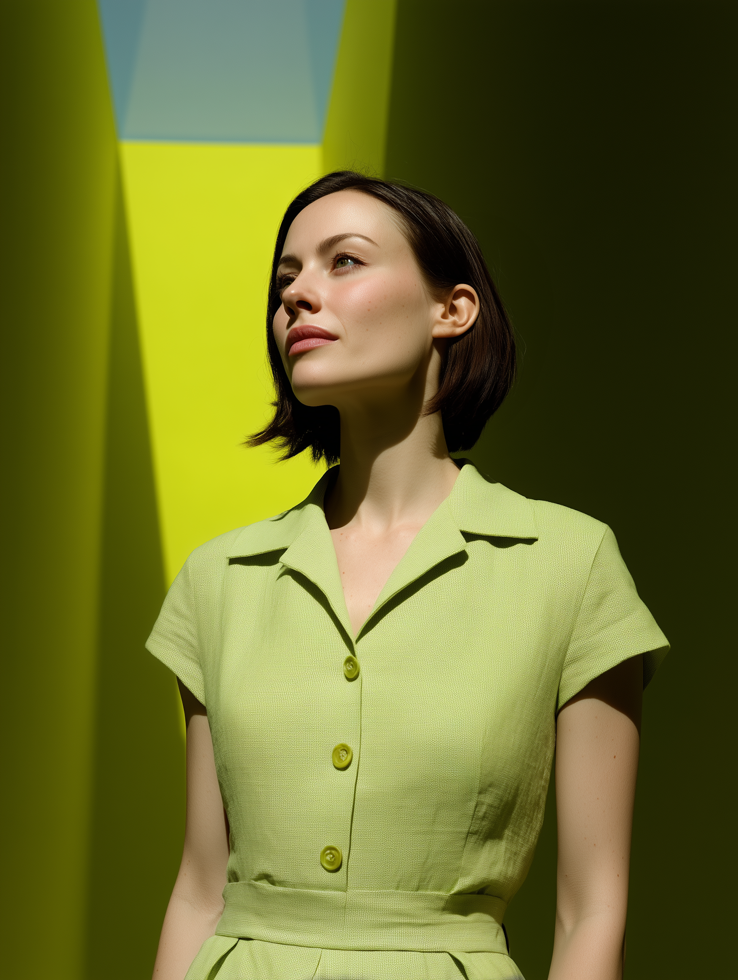 A serene woman in a light green dress gazes upward against a vibrant green and yellow background with a hint of blue sky.
