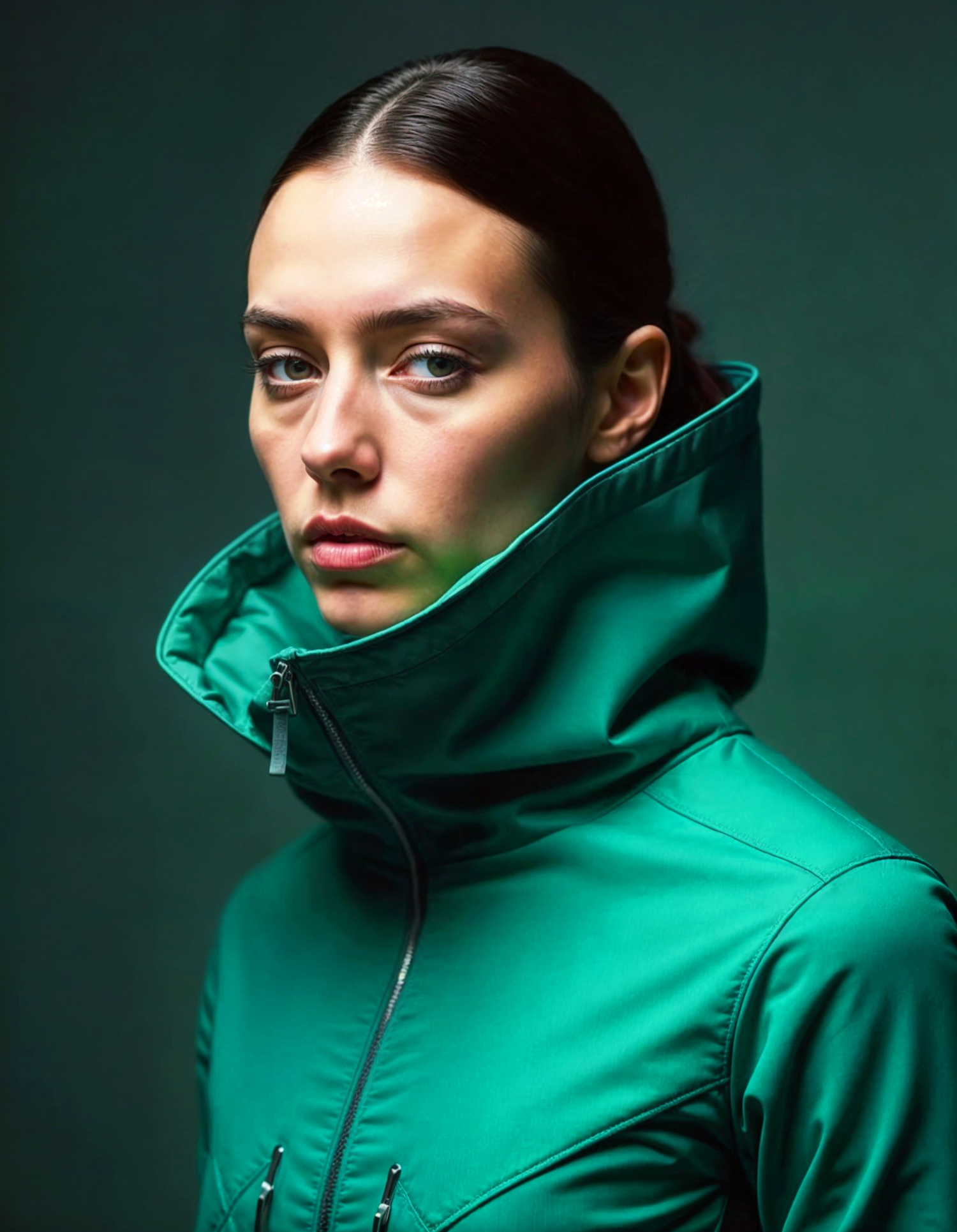 Woman in a high-collared green jacket with a serious expression against a dark green background.