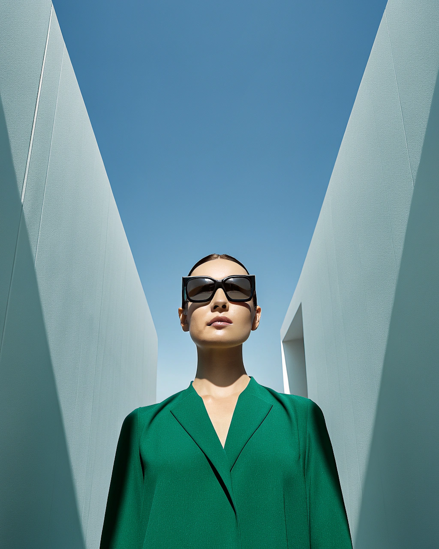 Stylish woman in green with sunglasses stands against a minimalist backdrop, framed by tall walls and a clear blue sky.