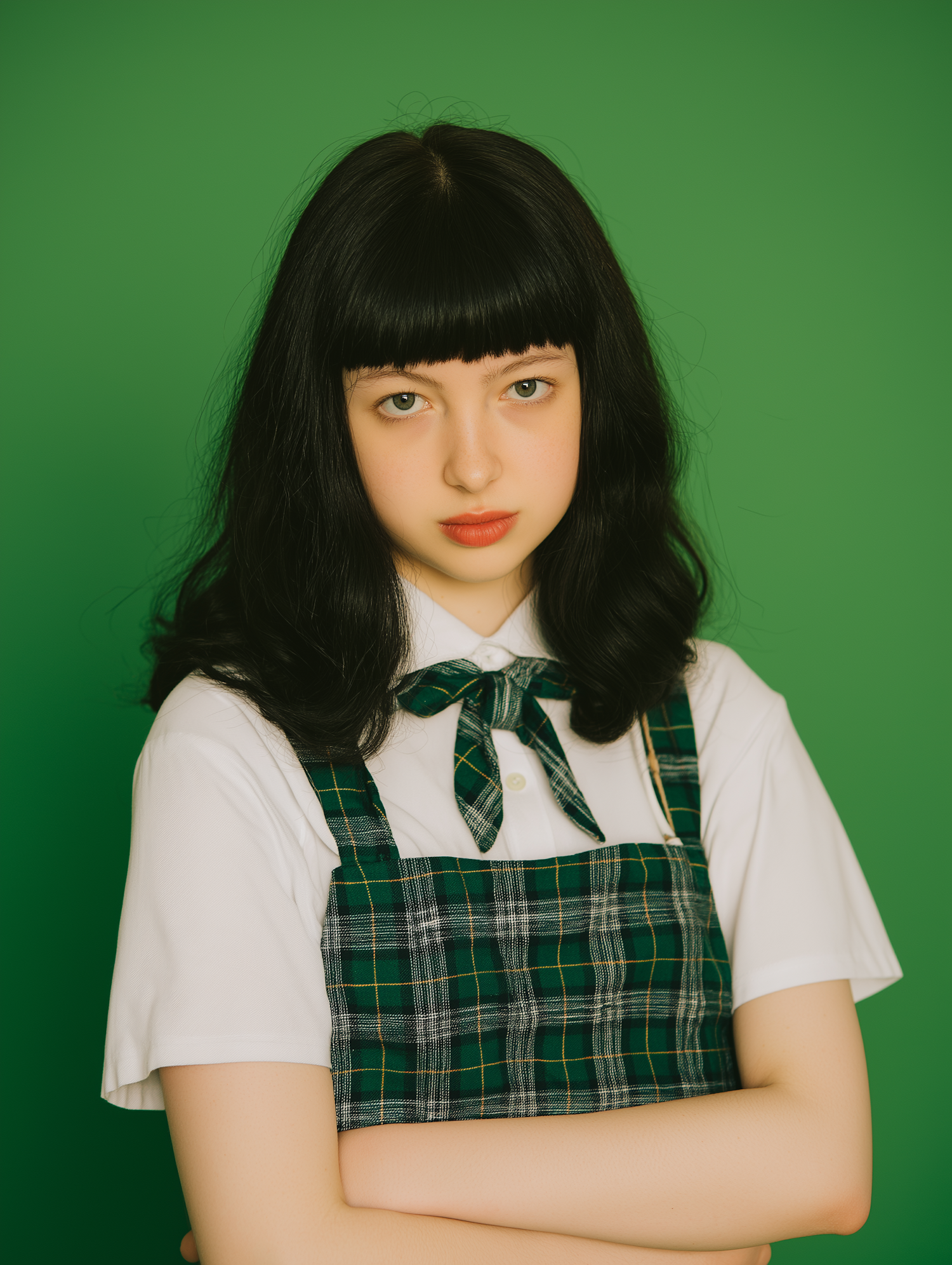 Young woman with black hair in a green plaid dress and white shirt, standing against a green background with a neutral expression.