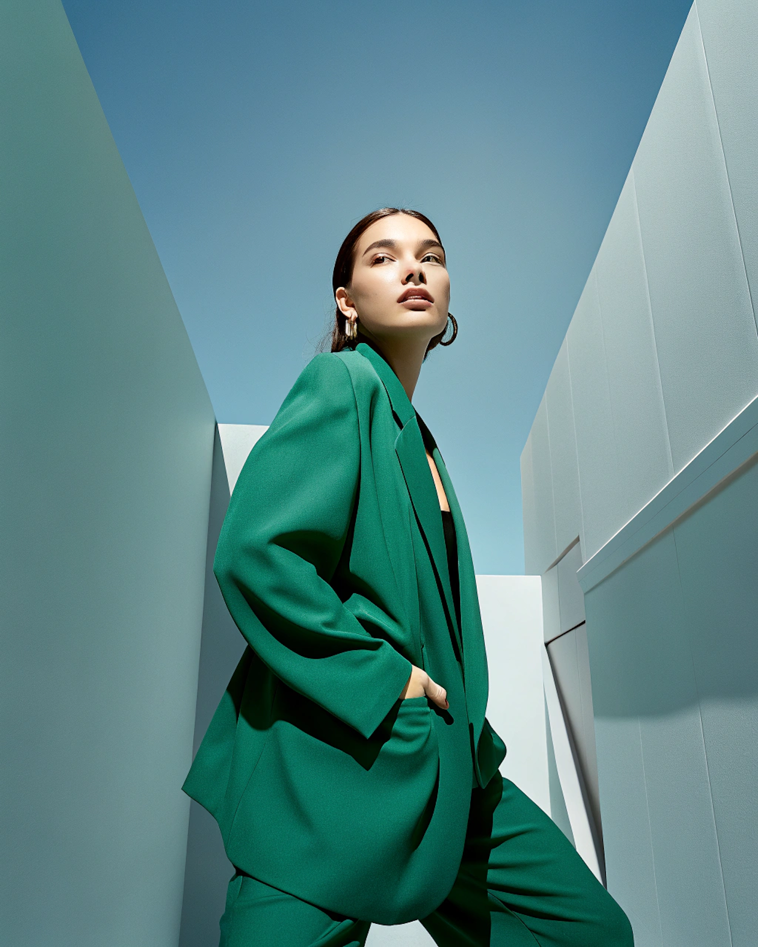 Confident woman in a green suit against a minimalist backdrop, exuding elegance and modern style.