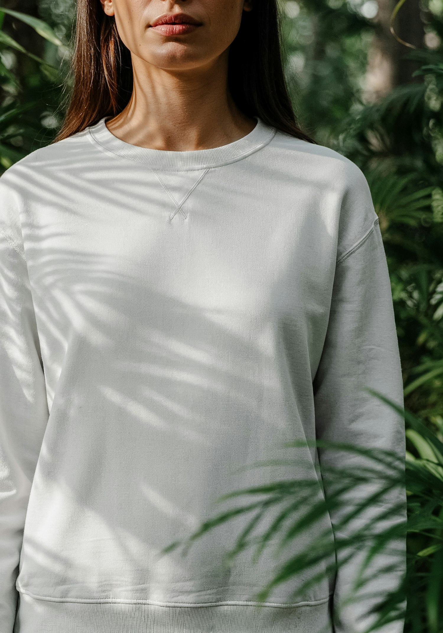Close-up of a woman in a white sweatshirt with leaf shadows, surrounded by lush greenery, creating a serene and natural vibe.
