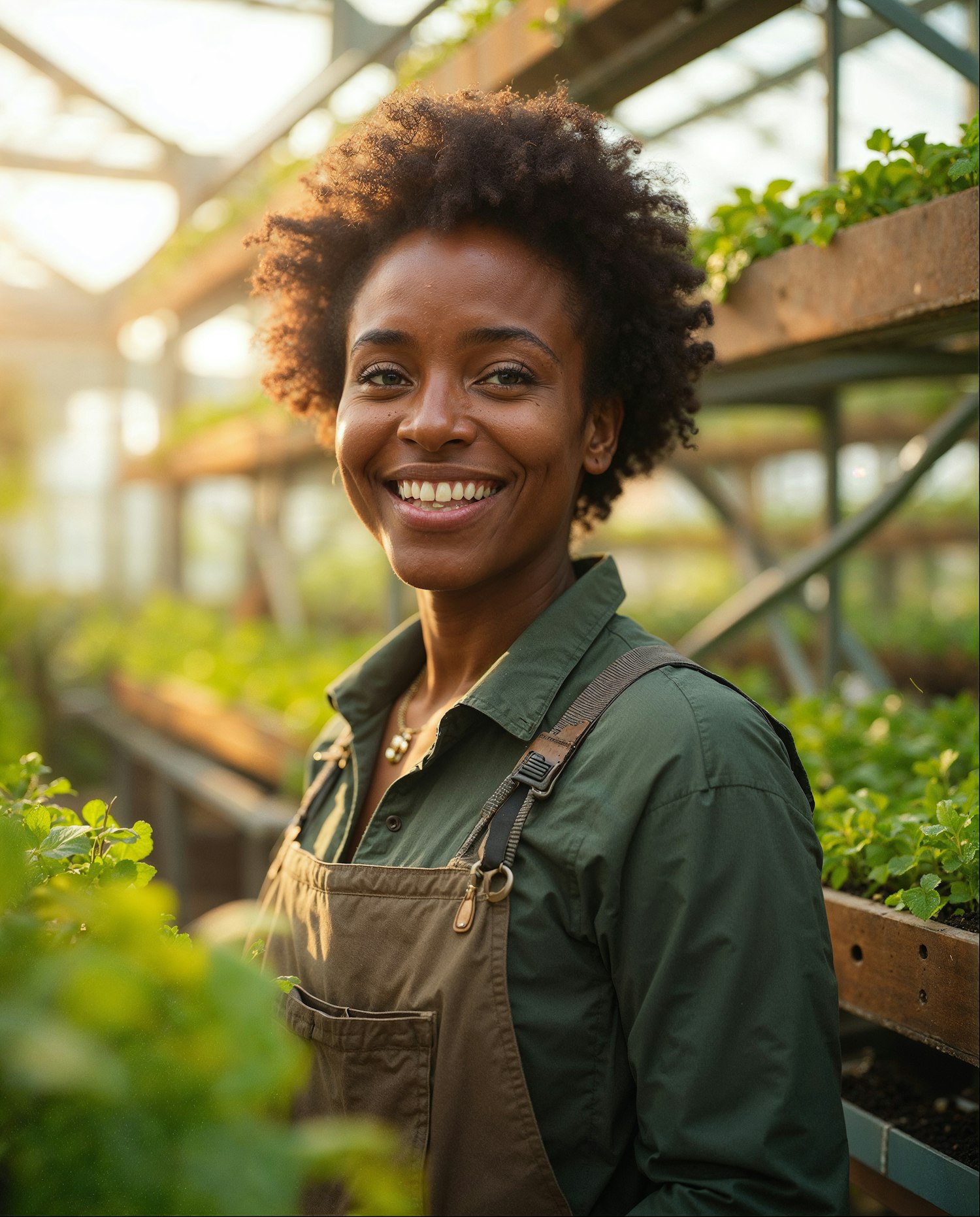 Smiling woman in a greenhouse, wearing a green shirt and brown apron, surrounded by lush plants and warm sunlight.