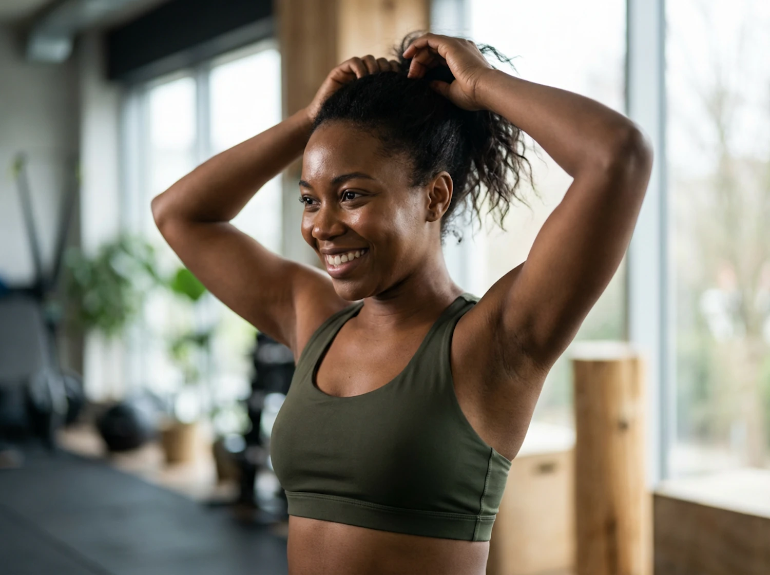 A woman in a gym tying her hair back, smiling, wearing a green sports bra, with gym equipment and natural light in the background.
