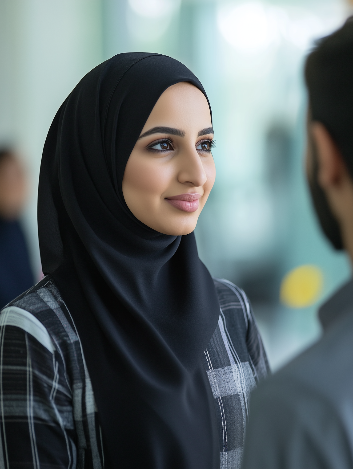 A woman in a black hijab smiles warmly at a man, set against a softly blurred indoor background.