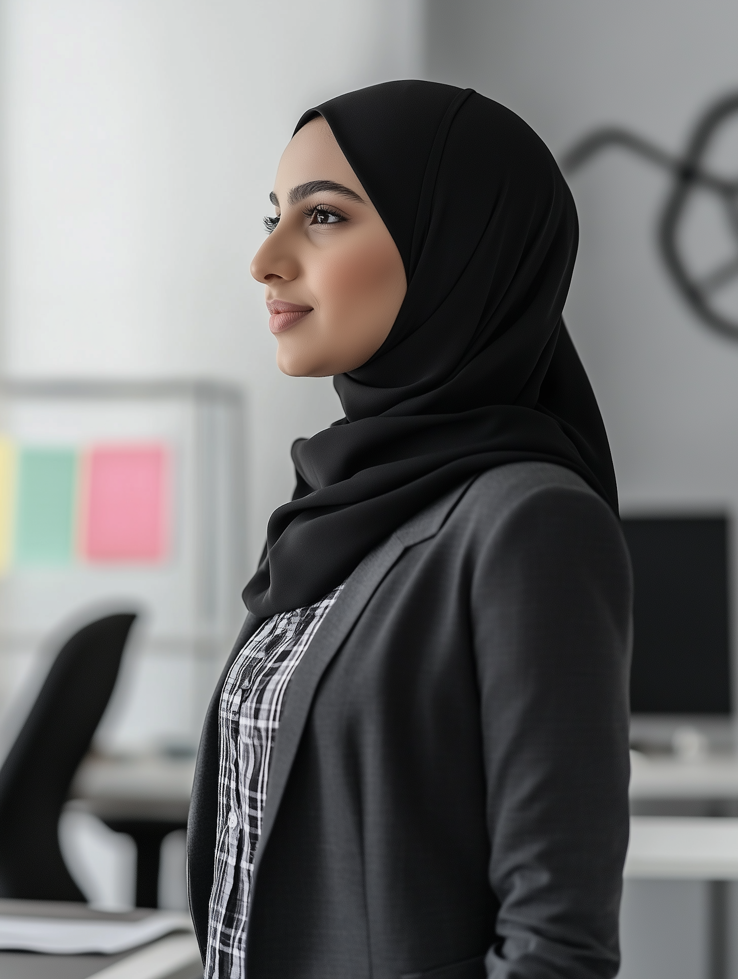 Confident woman in a black hijab and blazer in a modern office setting, exuding professionalism and focus.