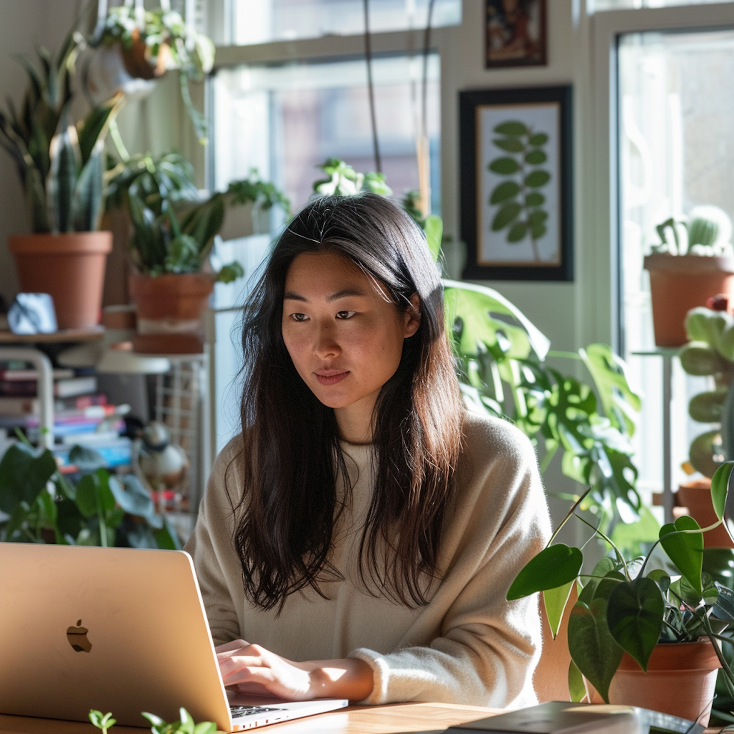 Asian woman working on a laptop in a plant-filled, sunlit room with cozy decor and botanical artwork, creating a serene workspace vibe.