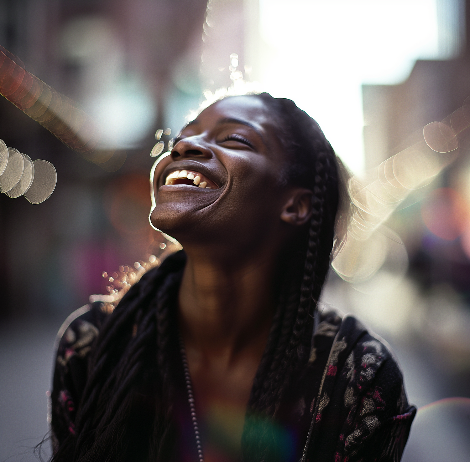 Joyful woman with braided hair laughing, surrounded by dreamy bokeh lights. Vibrant and uplifting atmosphere.