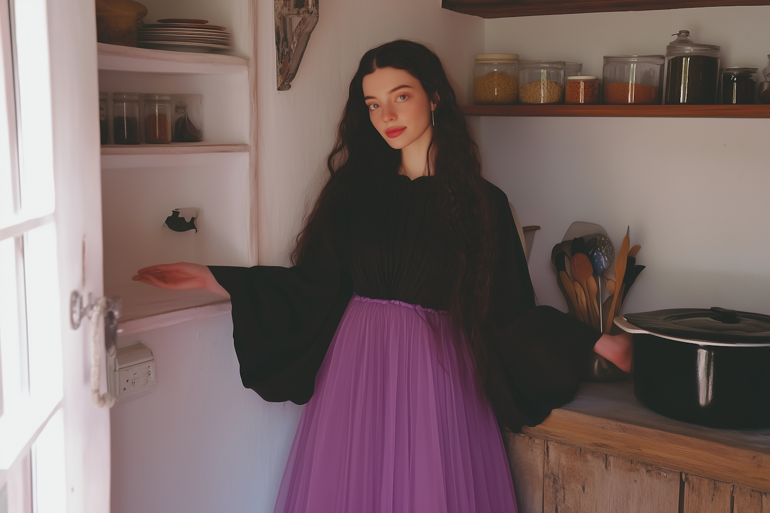 Young woman in a rustic kitchen, wearing a black top and purple skirt, surrounded by jars and a large pot on the counter.