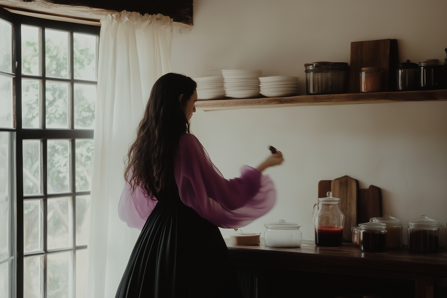 A woman in a rustic kitchen with wooden shelves and jars, wearing a purple blouse and black skirt, engaged in a domestic activity.