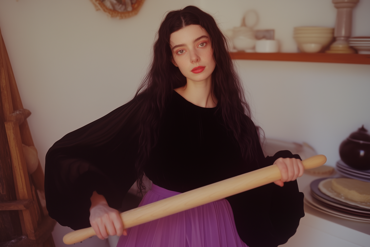 Young woman with long black hair holding a rolling pin in a cozy kitchen setting, wearing a black top and purple skirt.