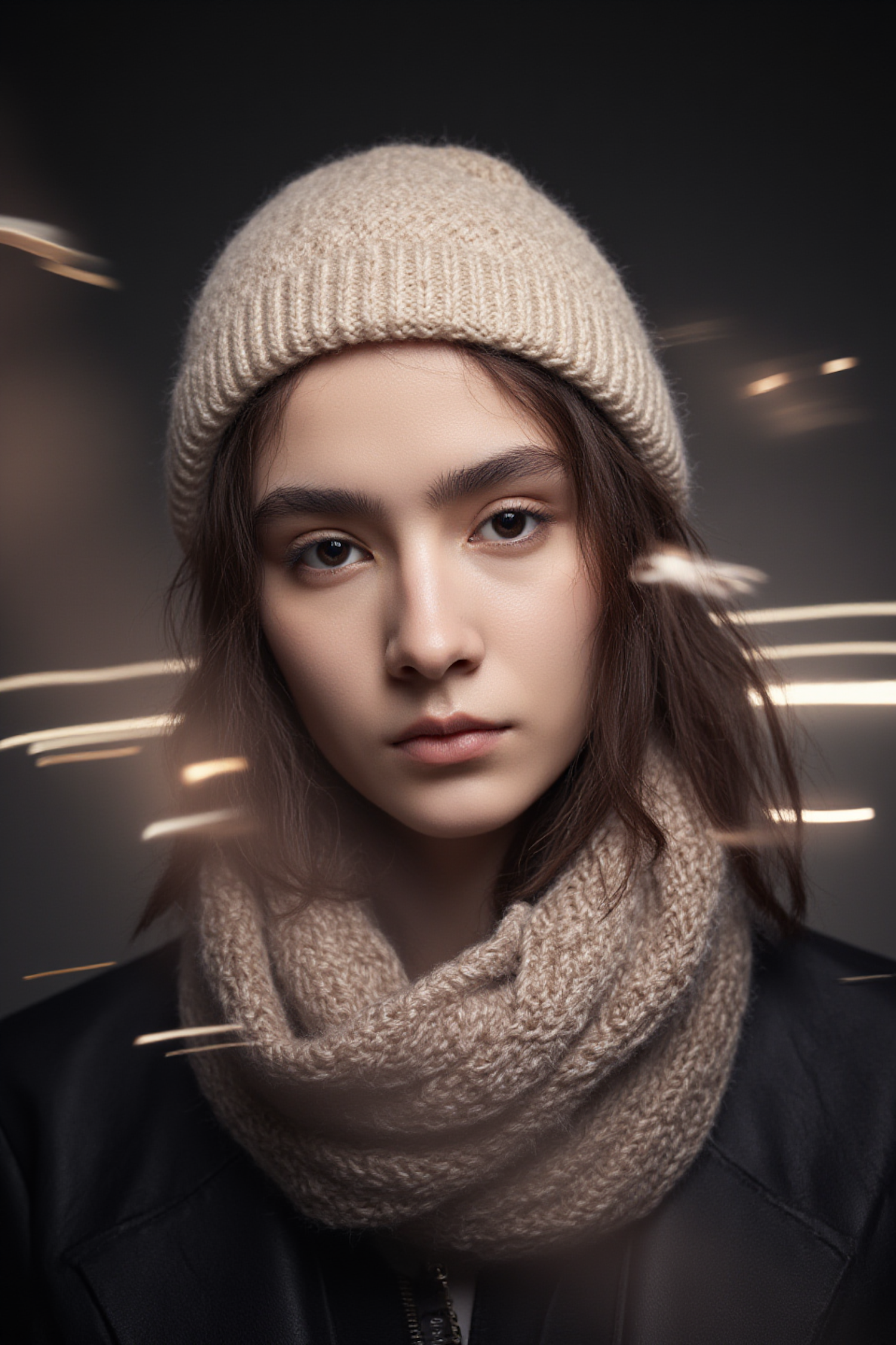 Portrait of a young woman in a beige beanie and scarf, wearing a black leather jacket, with warm light streaks in a dark background.