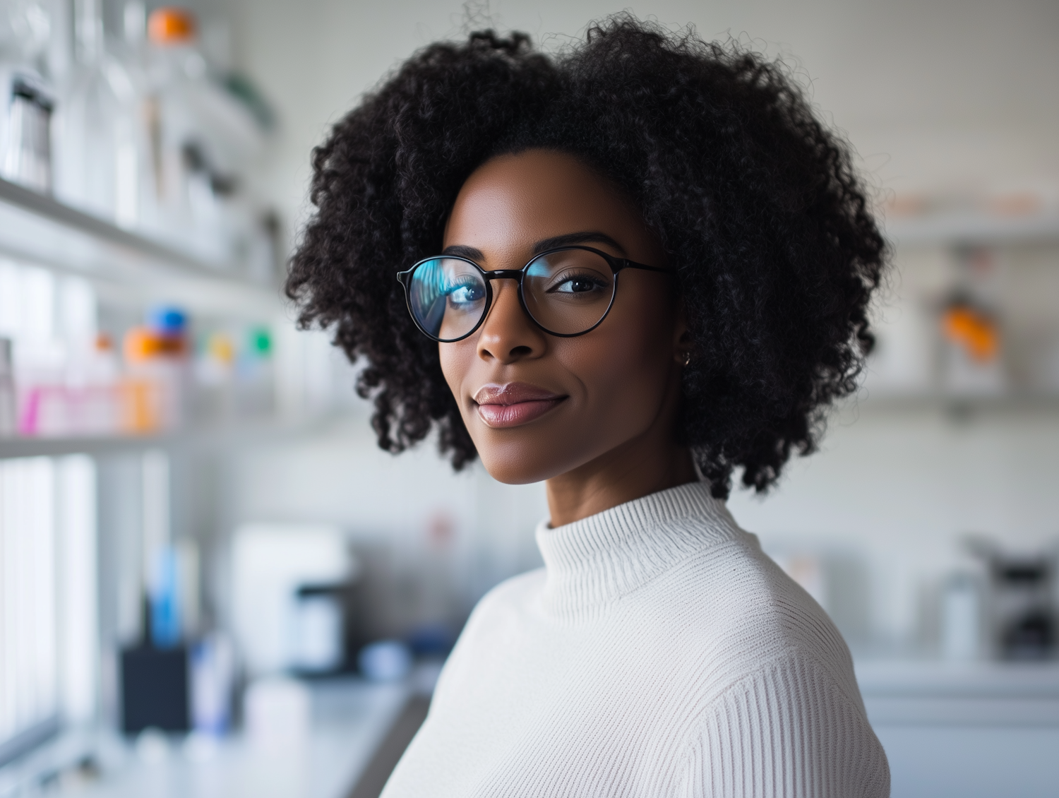 Confident Black woman in glasses and white sweater in a bright lab setting, exuding professionalism and warmth.
