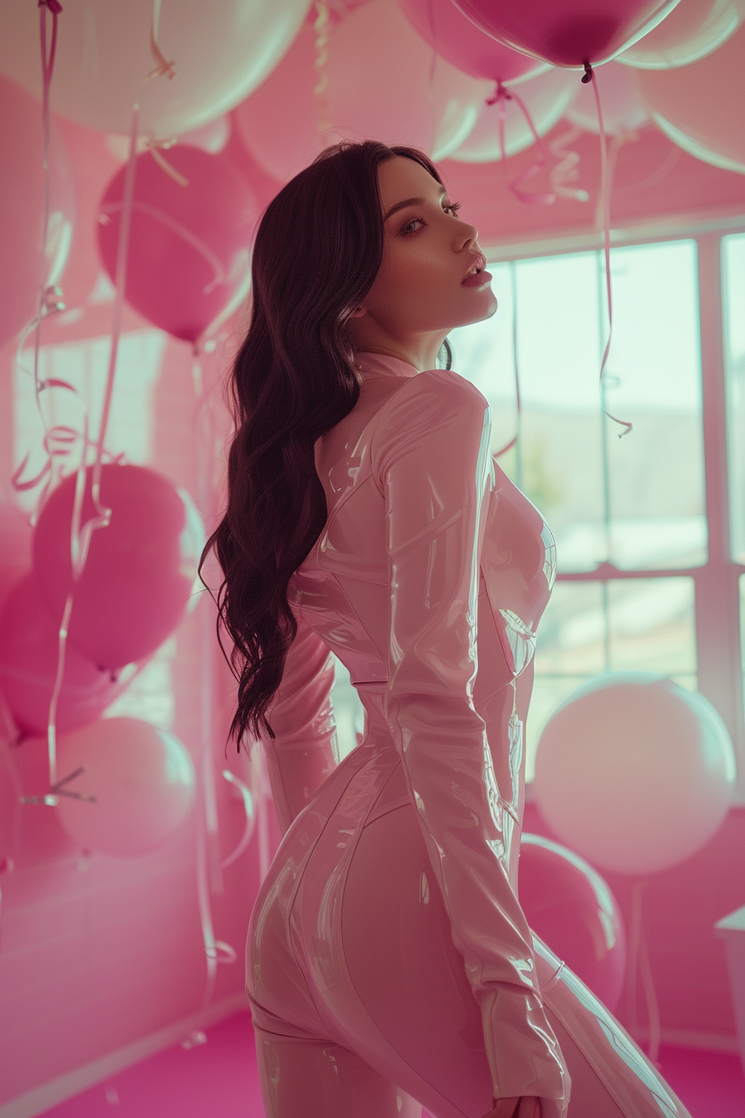 Woman in glossy pink outfit surrounded by pink and white balloons, creating a dreamy, festive atmosphere.