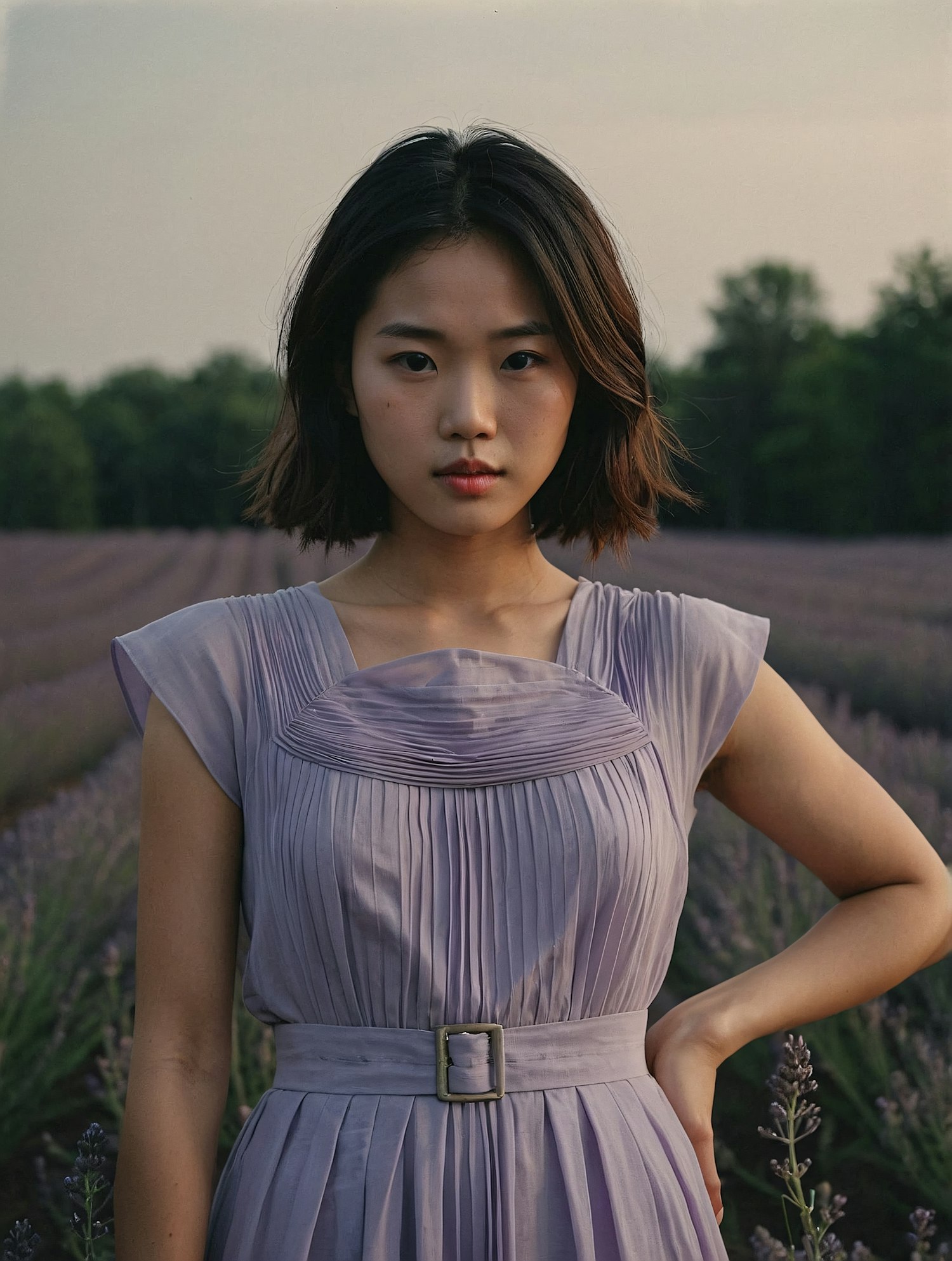 Asian woman in a lavender field wearing a pleated purple dress, with serene expression and soft evening light.