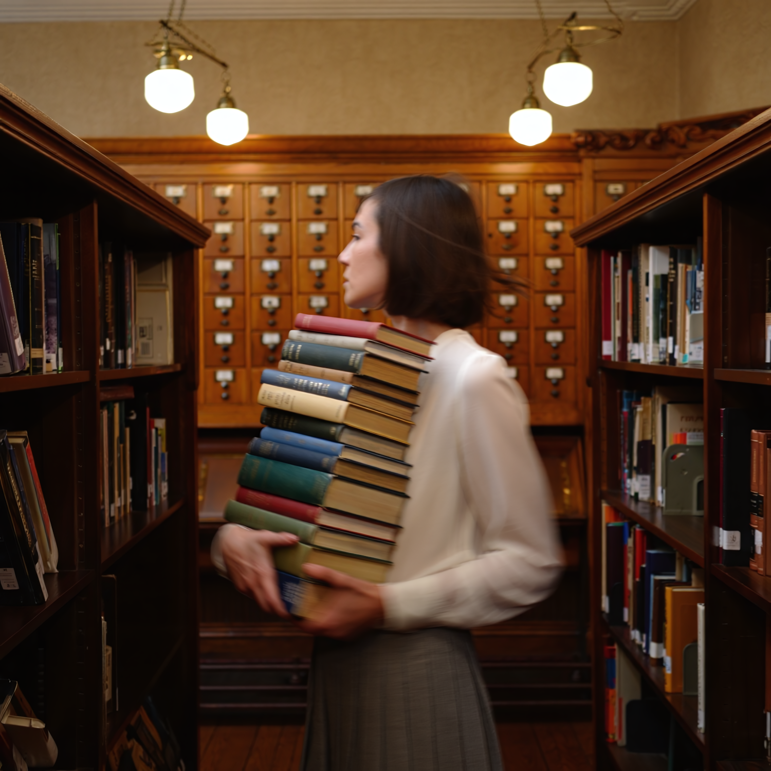A woman in a library carrying a stack of books, surrounded by bookshelves and a vintage card catalog. Warm lighting enhances the scene.