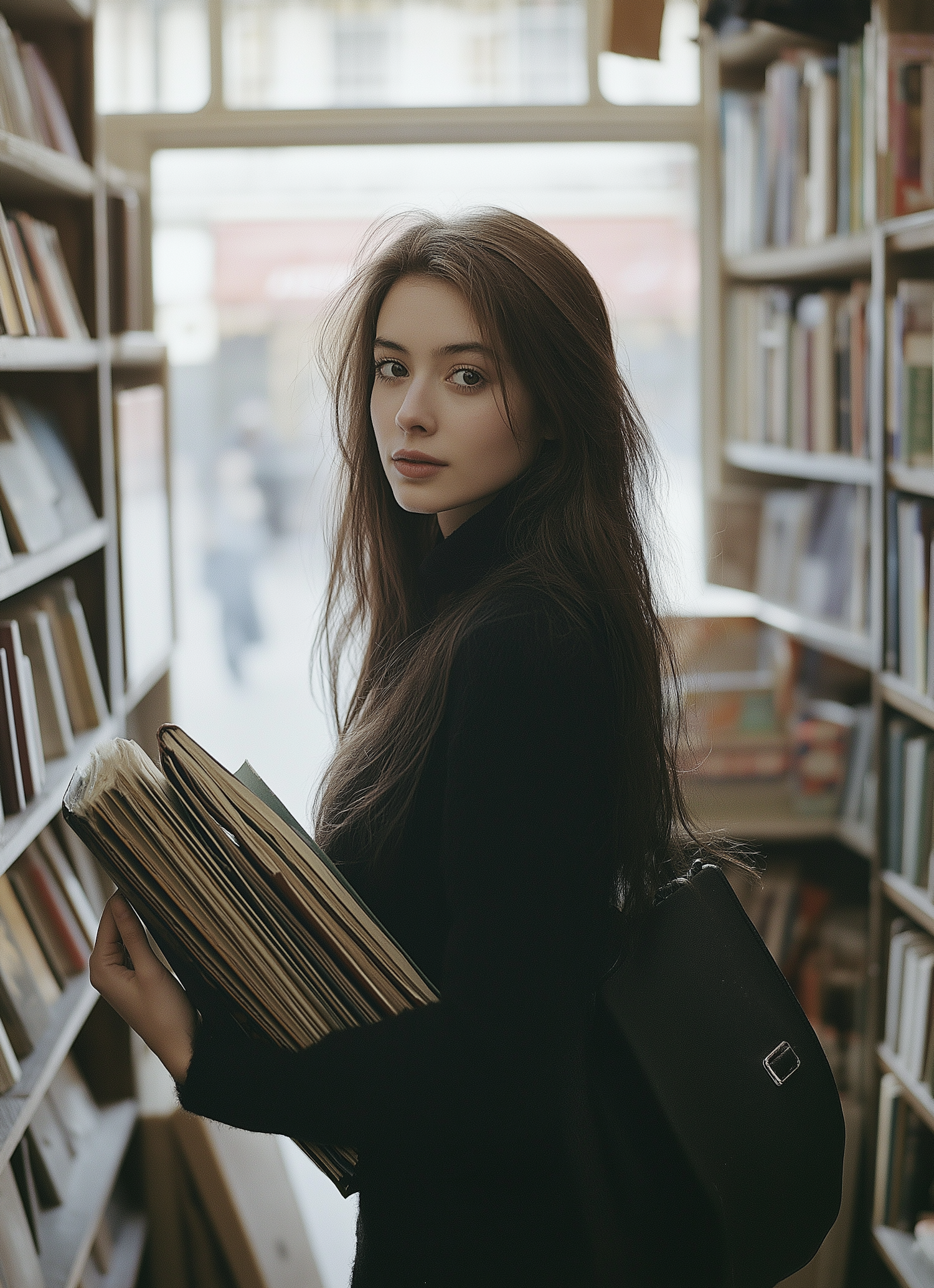 Young woman with long dark hair in a bookstore, holding books. Face blurred, wearing black top and backpack. Cozy, intellectual setting.