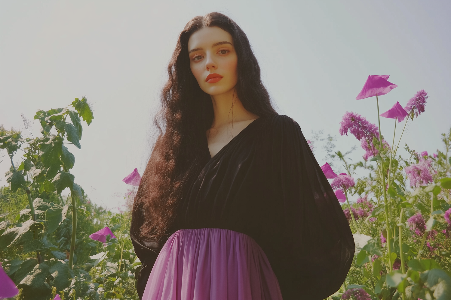 A serene woman in a black and purple dress stands in a lush garden with vibrant purple flowers, exuding elegance and tranquility.