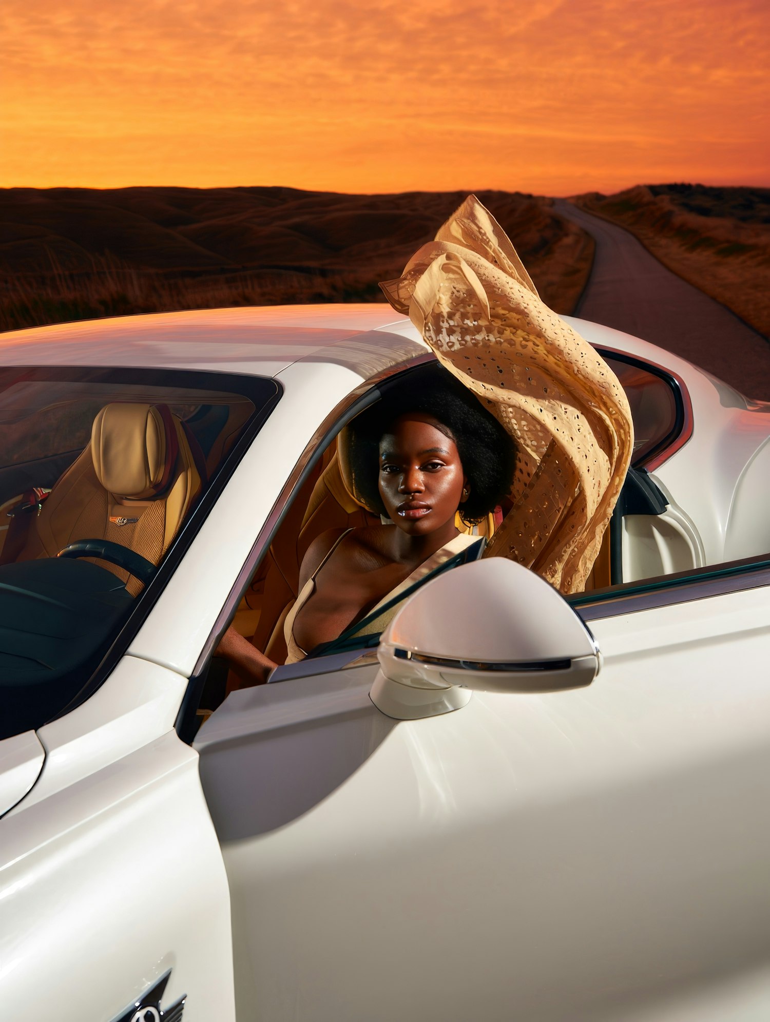 A stylish woman in a white luxury car against a stunning orange sunset, with a flowing scarf adding a dynamic touch.