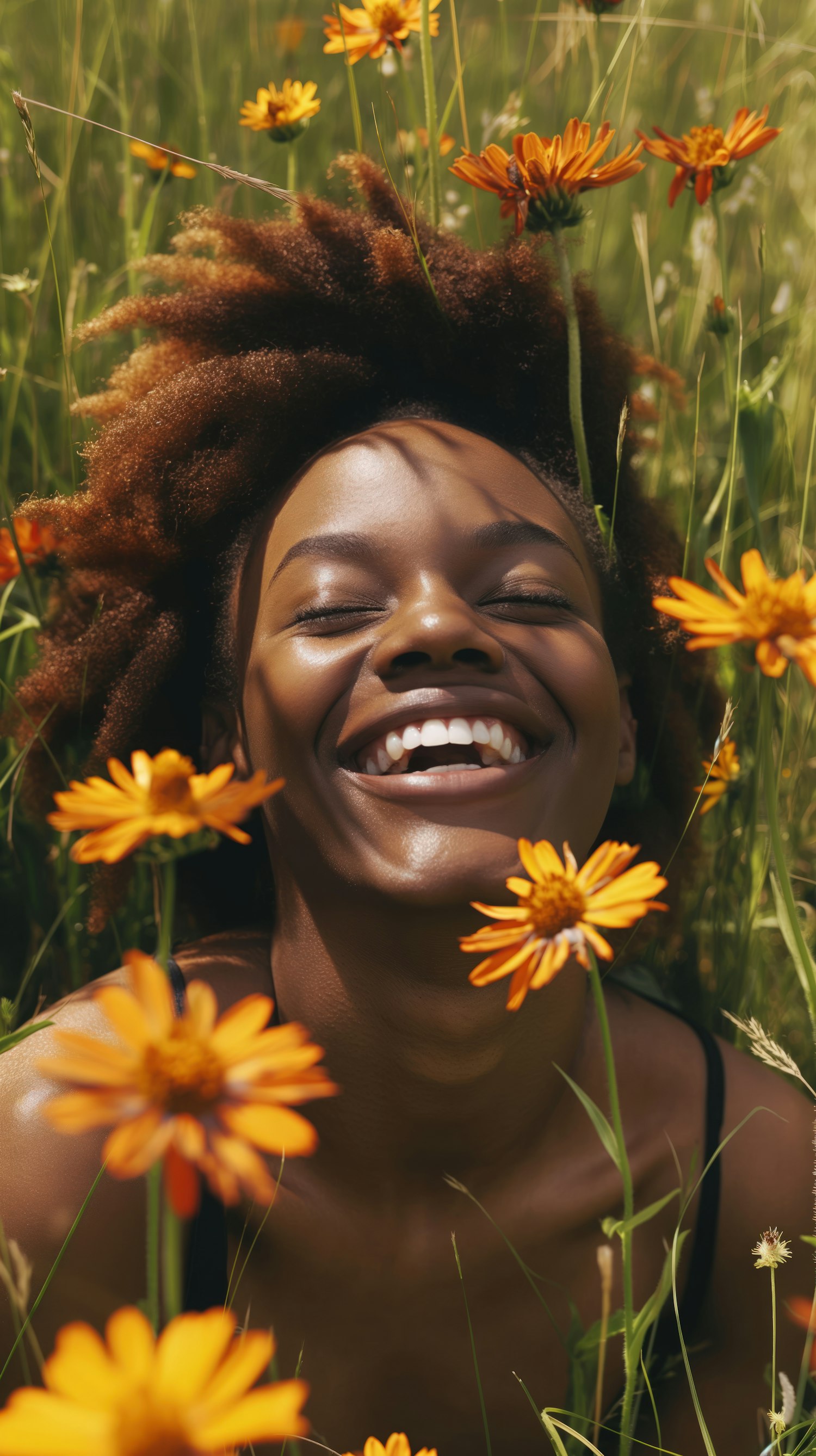 Joyful woman with natural hair smiling among vibrant orange flowers in a sunny field, capturing bliss and connection with nature.