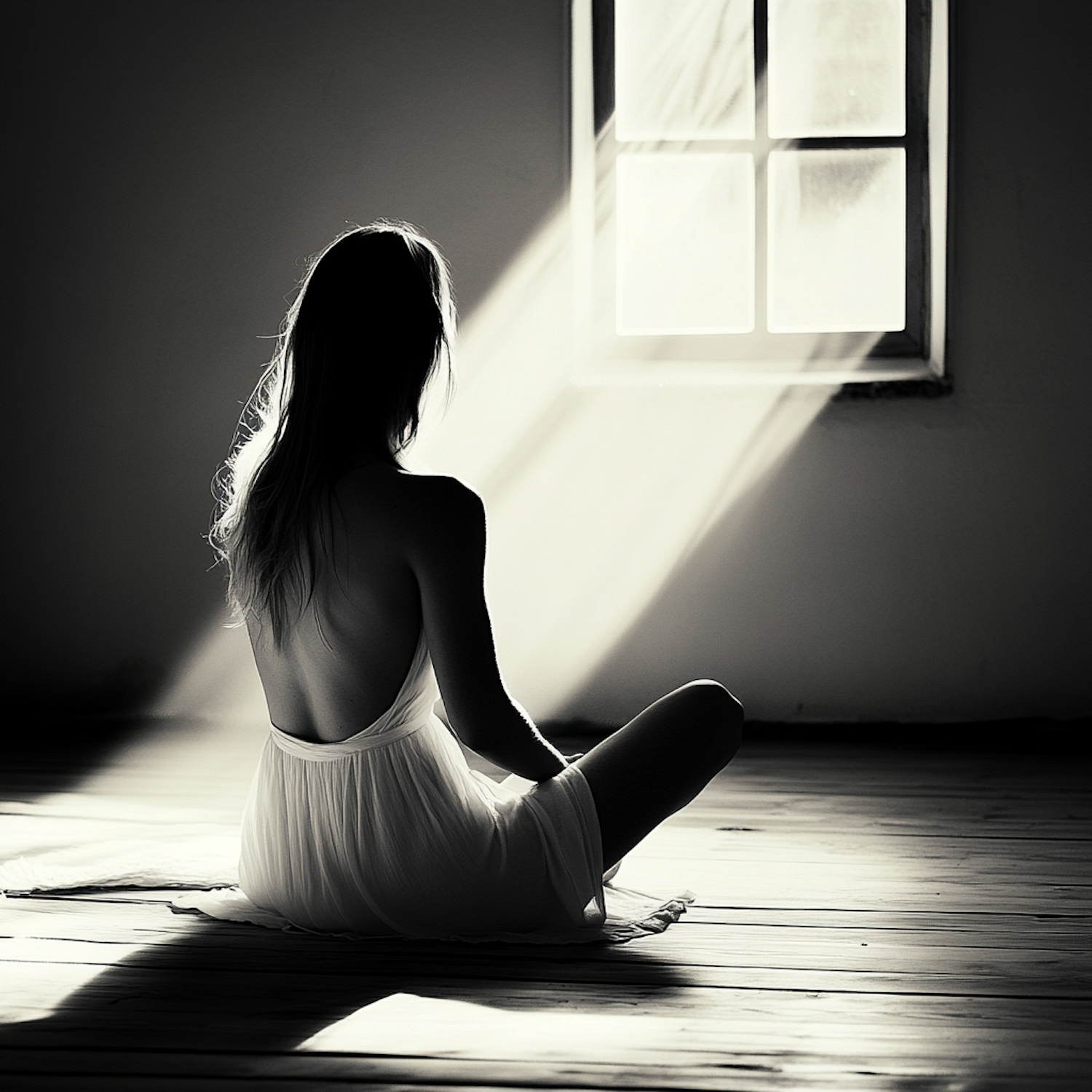 A serene black-and-white photo of a woman in a backless white dress sitting meditatively in sunlight streaming through a window.