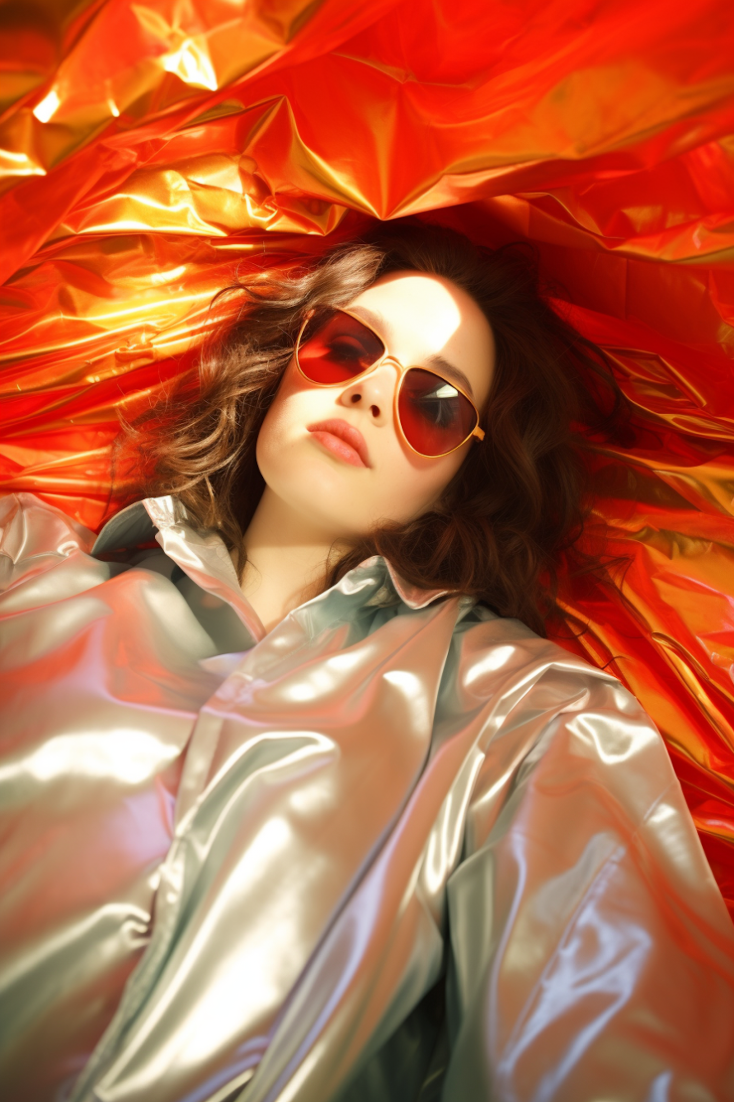 Woman in red sunglasses and metallic jacket on vibrant orange background, creating a bold and modern visual contrast.