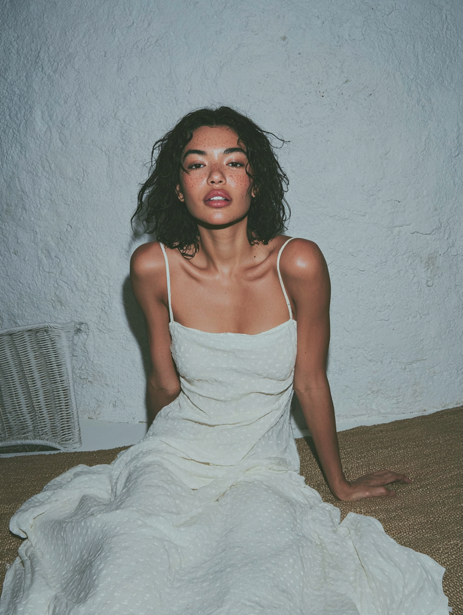 A woman in a white dress with a textured pattern sits against a white wall, exuding a natural and minimalistic vibe.